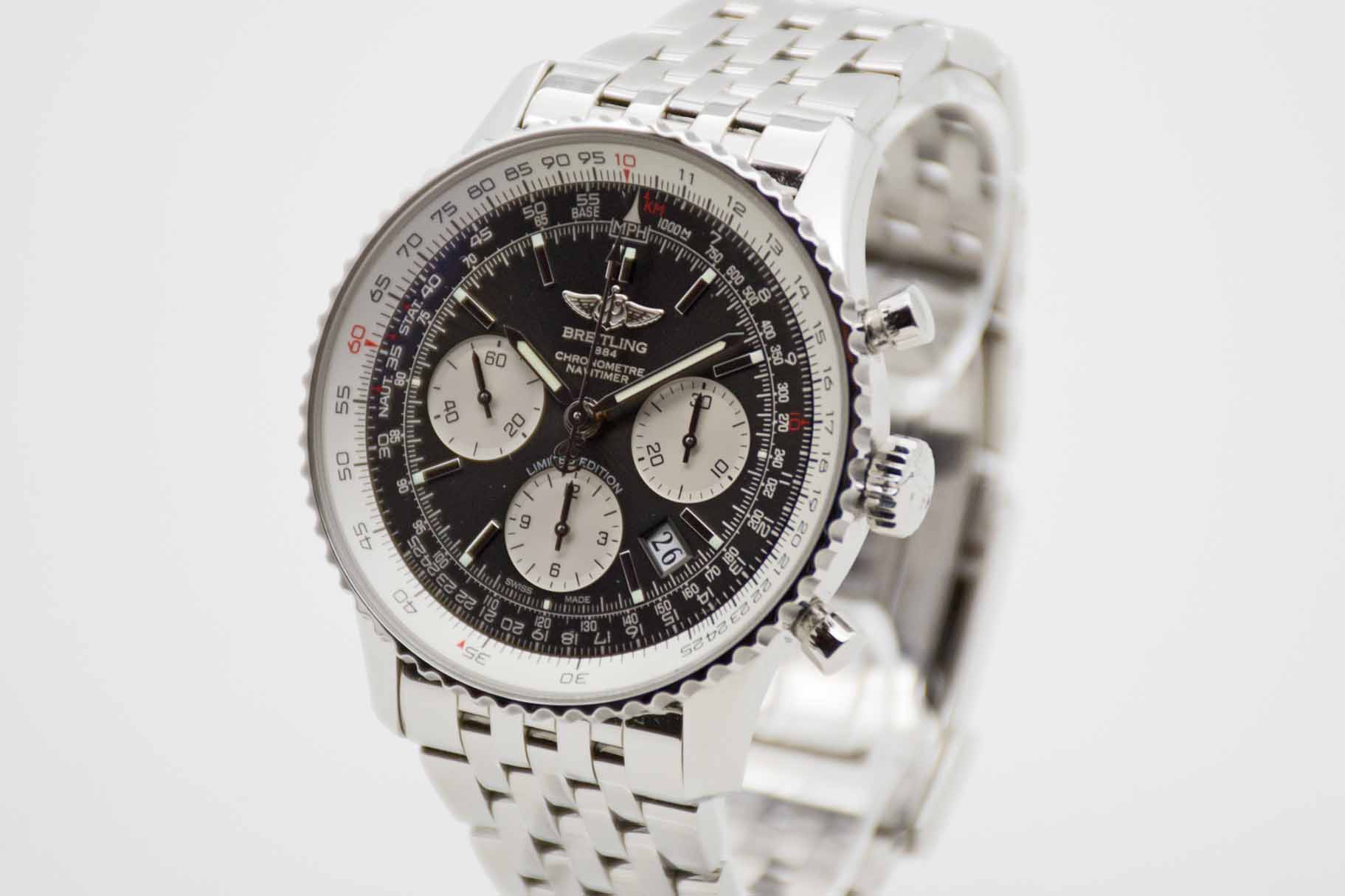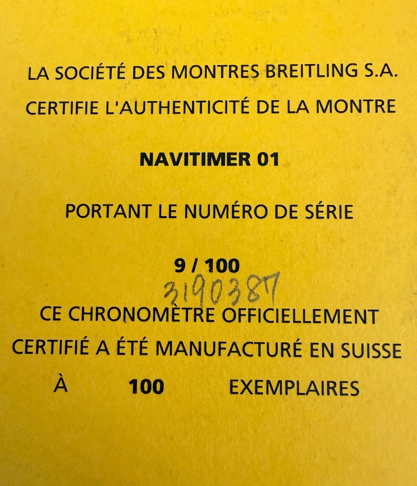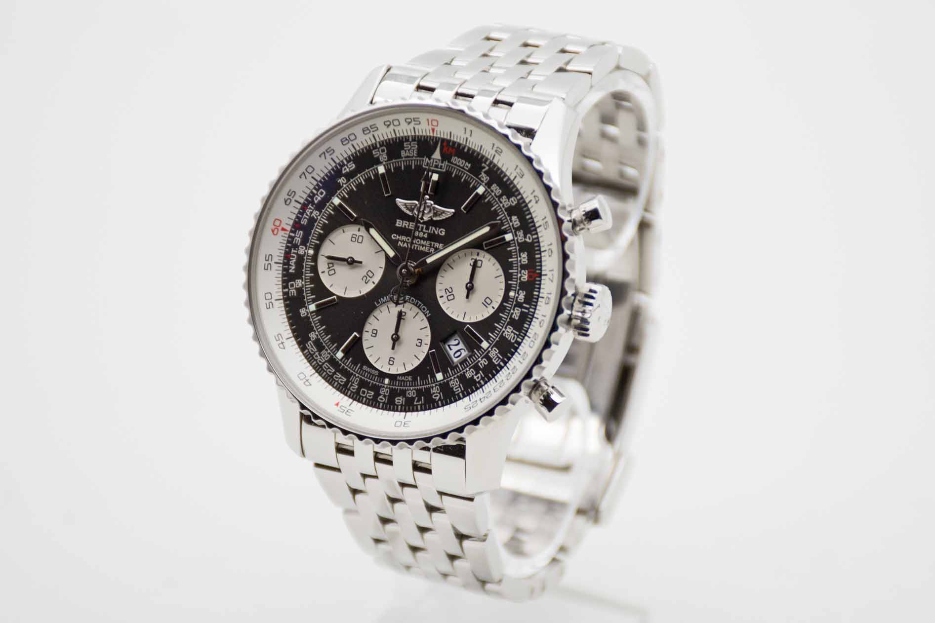 Navitimer B01 Chronograph 43 Japan Edition (Nr. 9 von 100 Exemplaren) AB019X/M535, 43 mm Gehäuse mit grauem Edition Zifferblatt mit weißgoldenem Wing Emblem und weißer Datumsscheibe am Breitling Pilots Edelstahlarmband in voller Länge. Eines der seltensten Navititimer Modelle am Markt. Fullset in Breitling Box mit Umkarton, allen Booklets und Anleitungen, Rechenschieber Modell, weiteres Bandglied, Limitierungs Zertifikat (Nr.9/100), Chronometer Zertifikat, Leder Etui und Breitling Garantiekarte aus 2016. Unser Navitimer Japan Edition befindet sich in perfektem und neuwertigem Zustand. Inzahlungnahmen sind nur bei direktem Kontakt möglich.