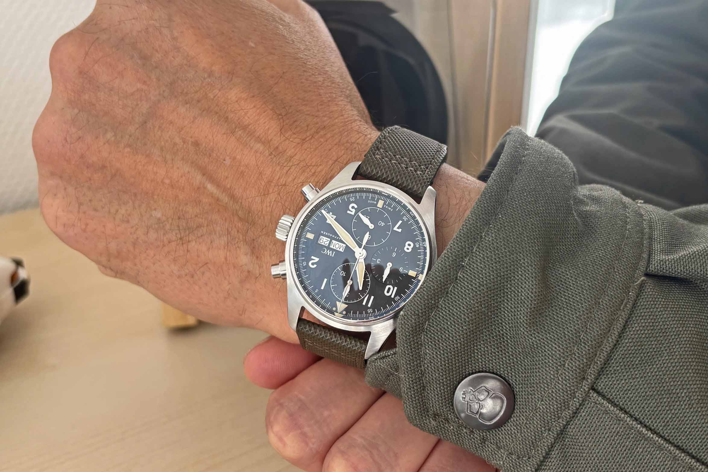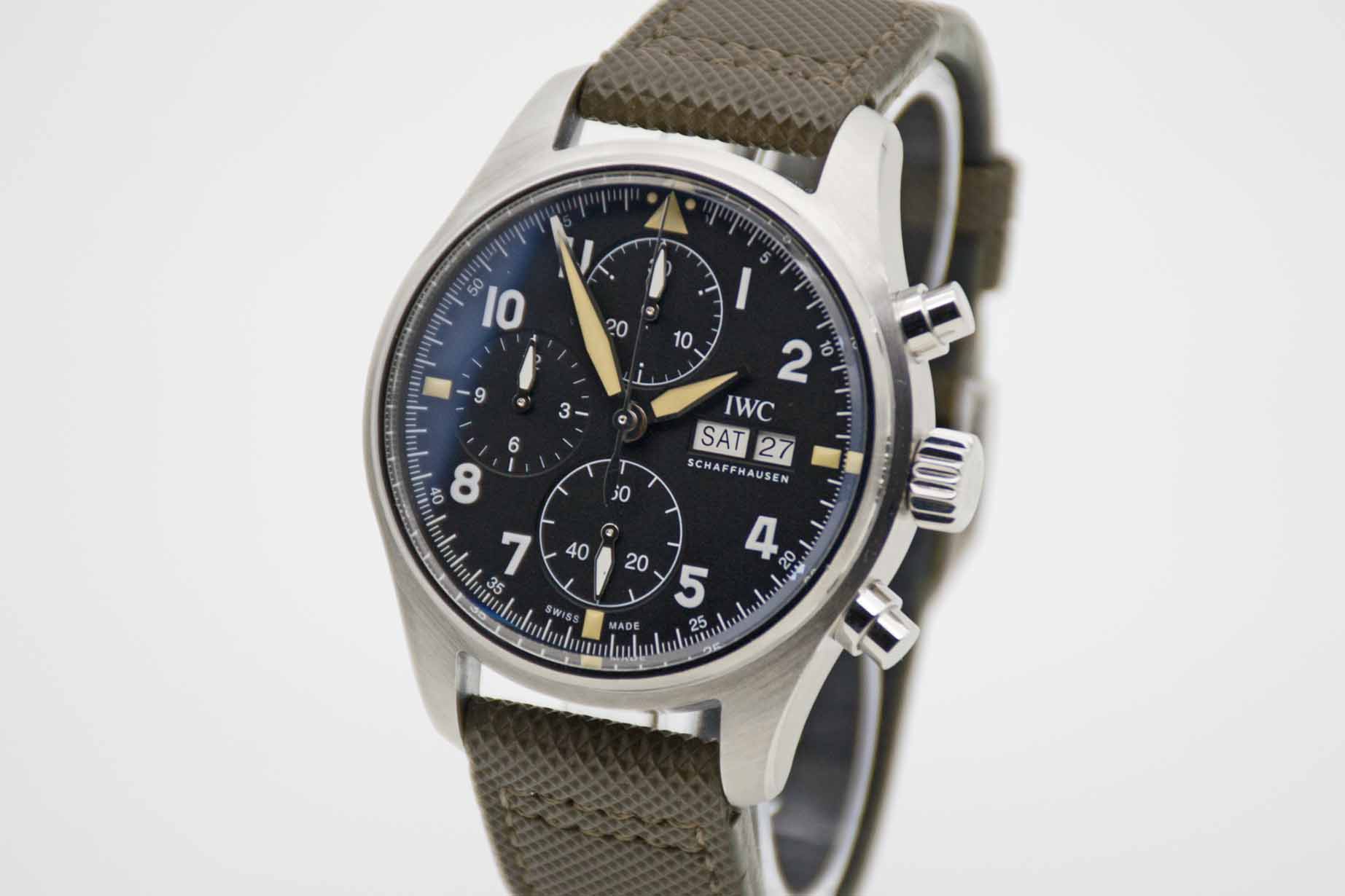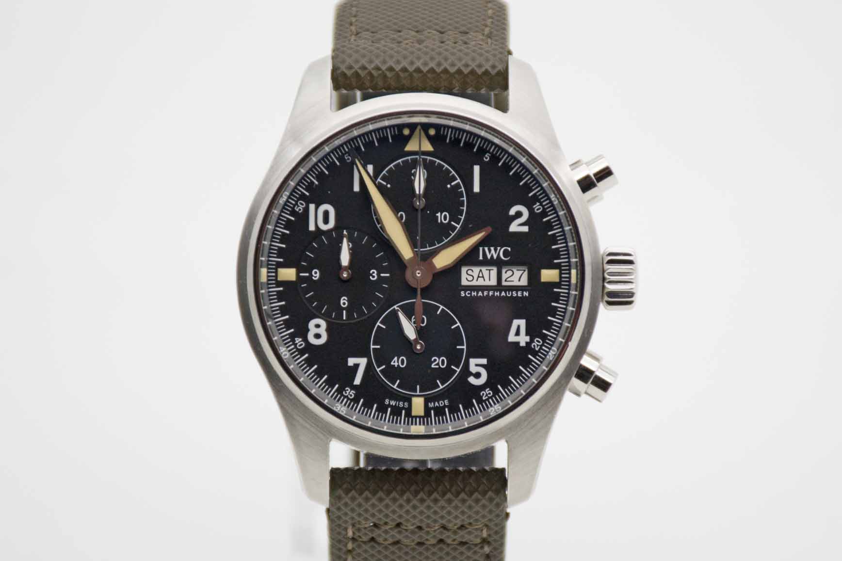 IWC Pilot Chronograph Spitfire IW387901, 41 mm Gehäuse mit schwarzem Zifferblatt und grünem Nylon/Leder Armband mit IWC Dornschließe. Sehr gepflegter Piloten Chronograph in IWC Box mit sauberem Inlay, IWC Putztuch, Garantie Booklet und IWC Garantiekarte aus 2019. Die Uhr ist frisch gewartet und befindet sich in perfektem und neuwertigem Zustand. Gerne nehmen wir Ihre hochwertige Armbanduhr in Anzahlung. Zu unserer Sicherheit lagern wir sämtliche Uhren unseres Bestandes extern im Banksafe, daher bitten wir um vorherige Terminvereinbarung.