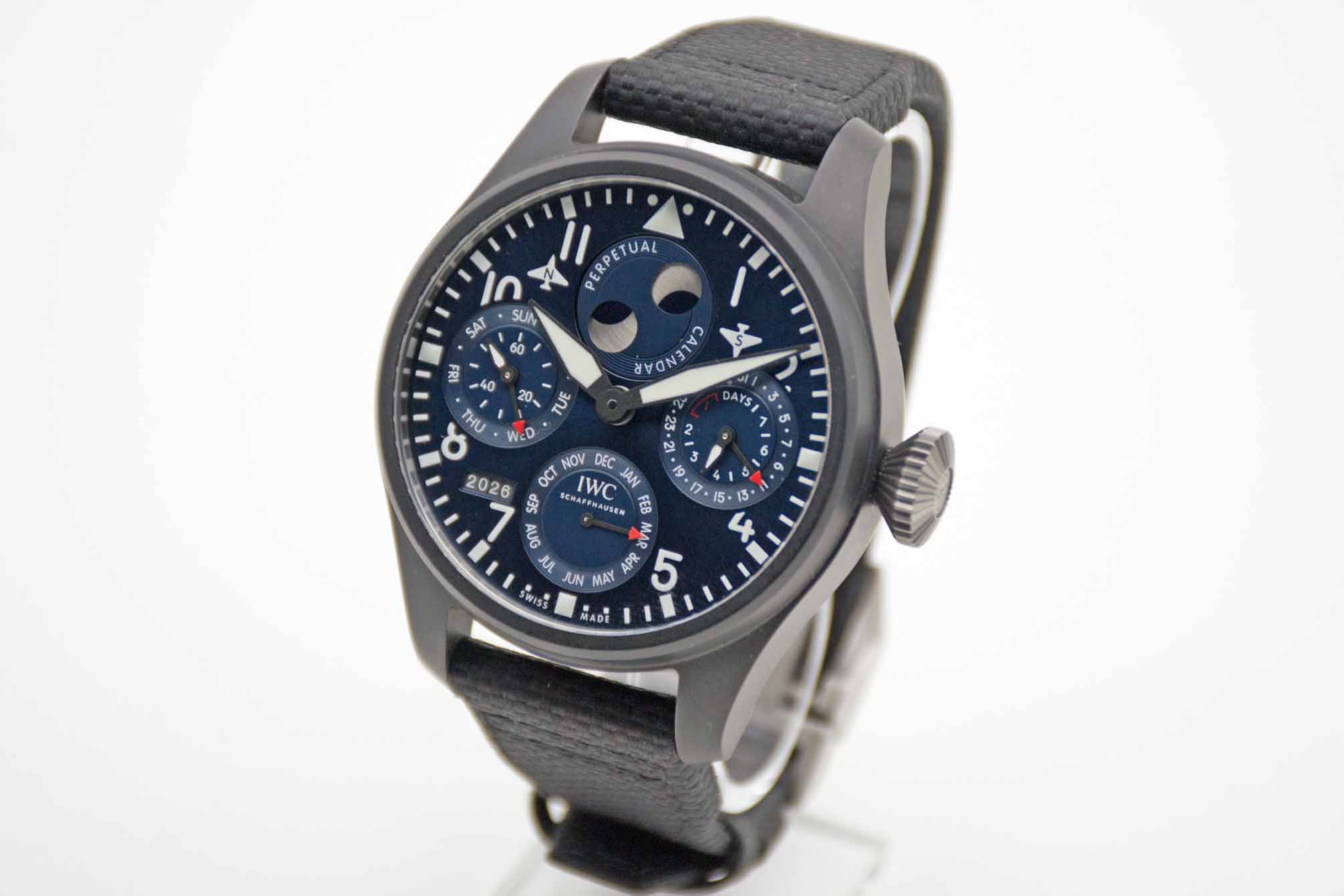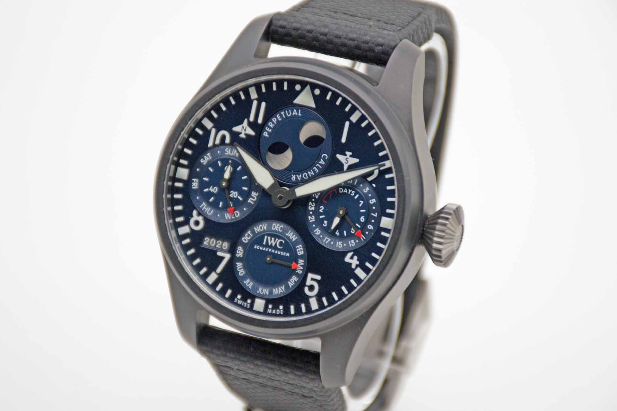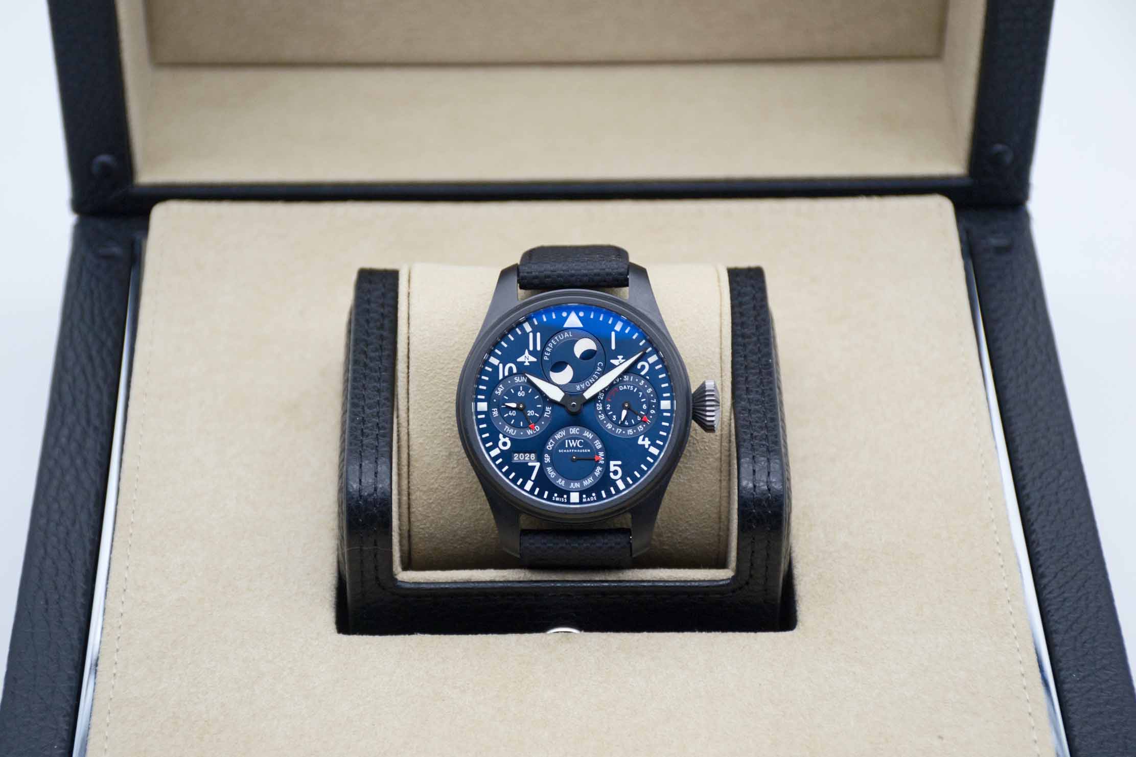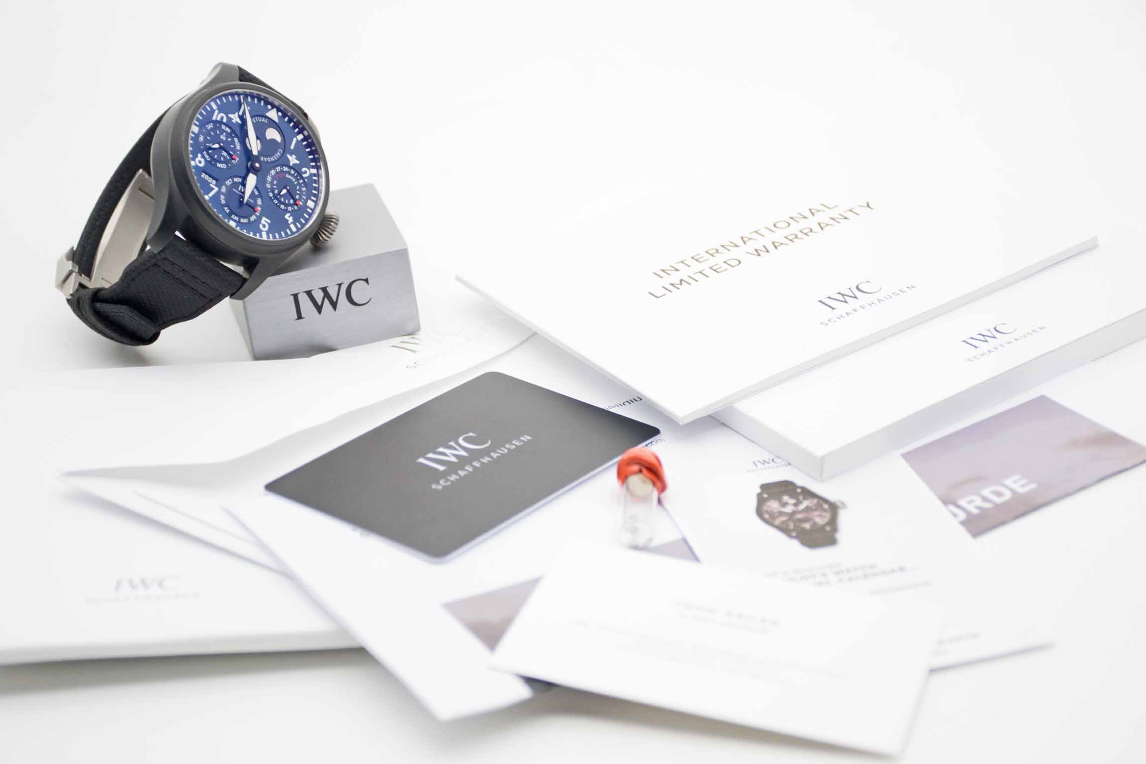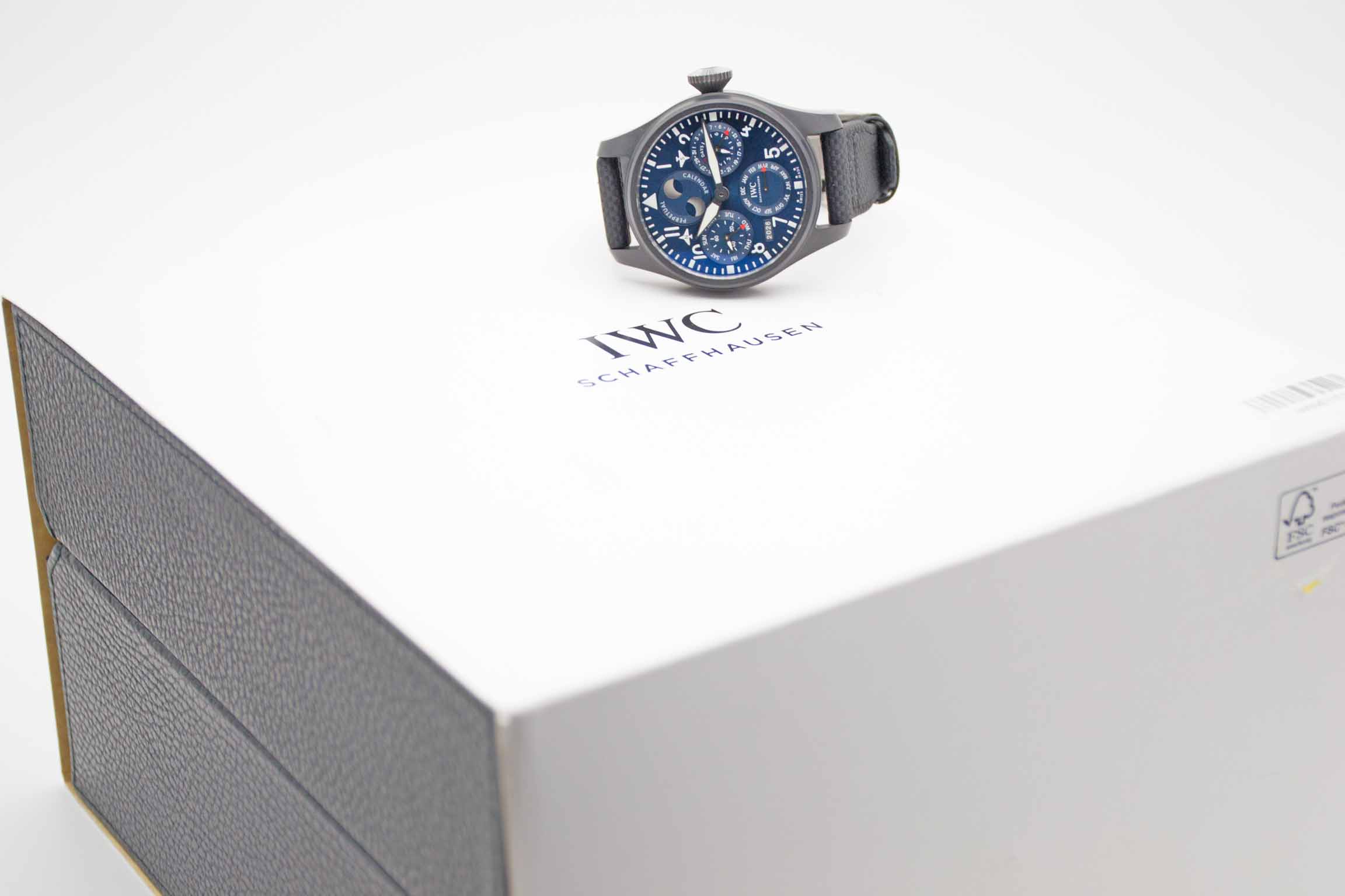 IWC Große Fliegeruhr Big Pilot Ewiger Kalender Edition Rodeo Drive IW503001, 46,5 mm Gehäuse aus schwarzer Keramik mit blauem Rodeo Drive Edition Zifferblatt und neuwertigem IWC Nylon/Lederarmband mit IWC Faltschließe. Neuwertiges Fullset in großer IWC Lederbox mit Umverpackung, Garantie Booklet, IWC Putztuch, PPC Bedienungsanleitung, Datumsscheiben, IWC Garantieverlängerung bis 2031 und IWC Garantiekarte aus 2023. Die Uhr ist nahezu ungetragen und befindet sich in perfektem und neuwertigem Zustand. Inzahlungnahmen sind nur im direkten Geschäft möglich. Bitte sprechen Sie uns hierzu gerne an. Zu unserer Sicherheit lagern wir sämtliche Uhren unseres Bestandes extern im Banksafe, daher bitten wir um vorherige Terminvereinbarung.