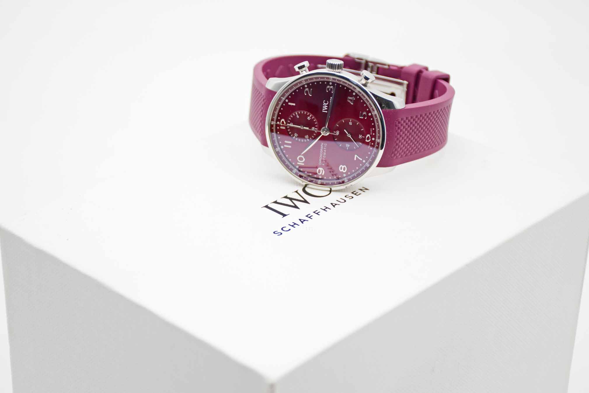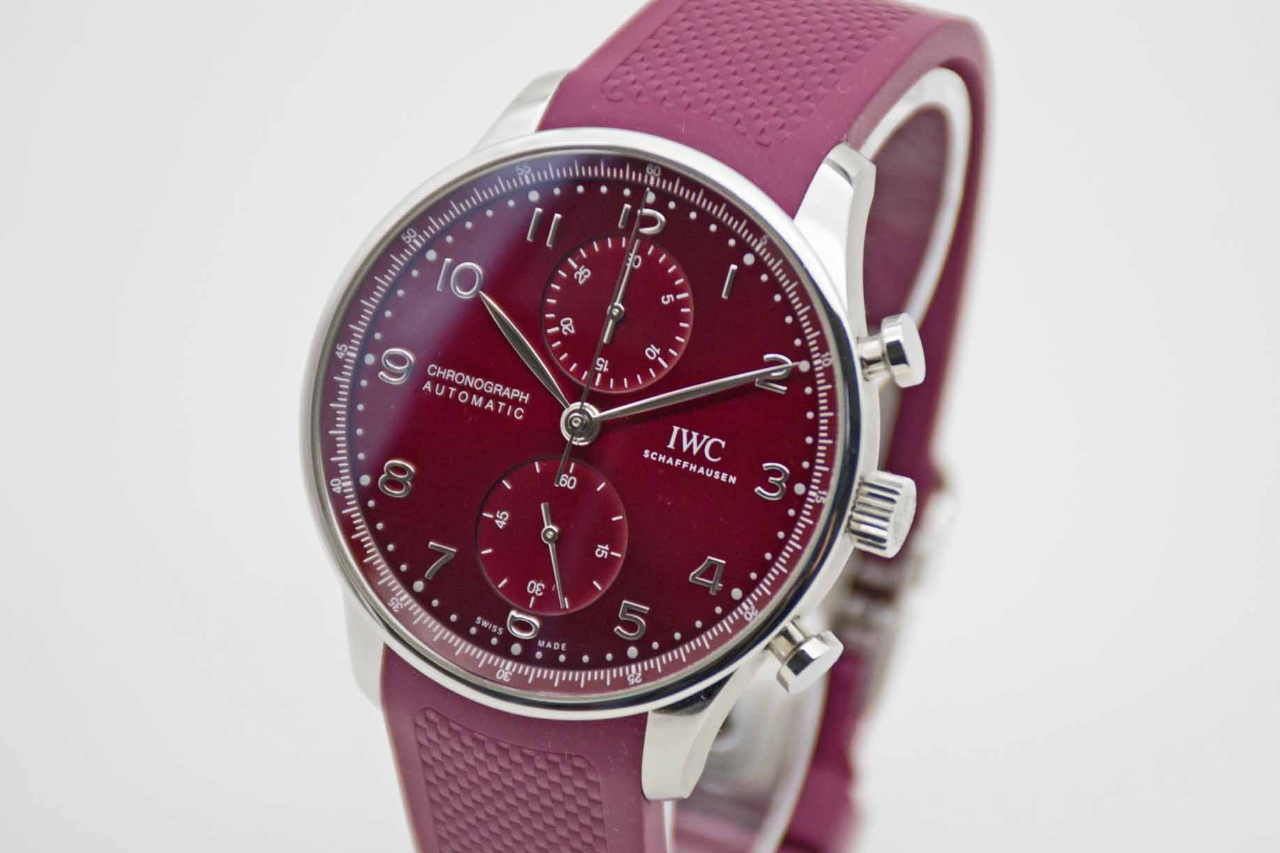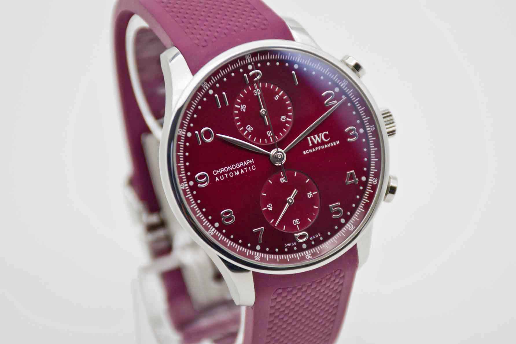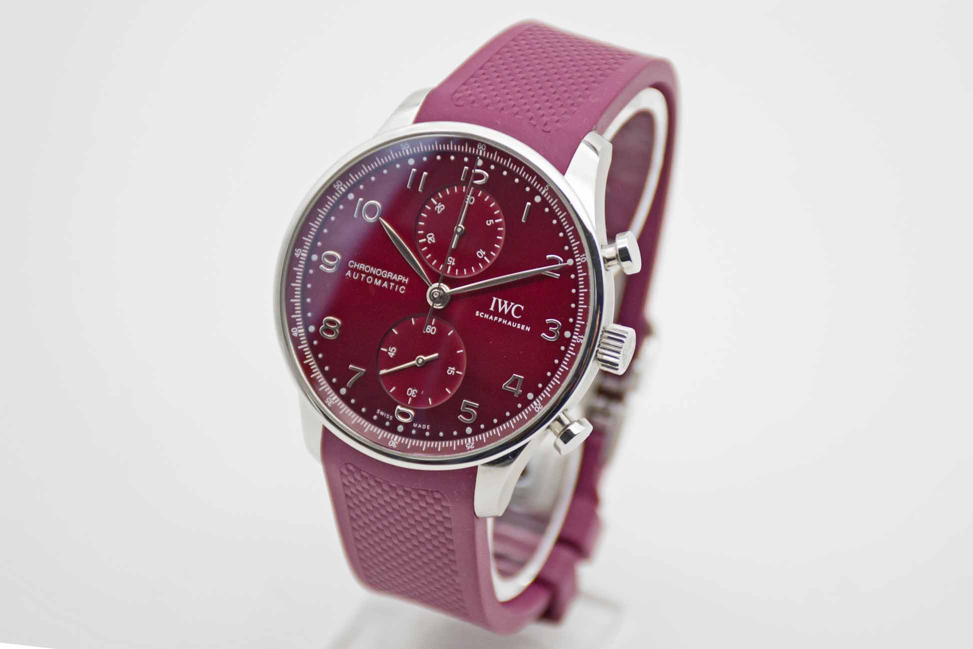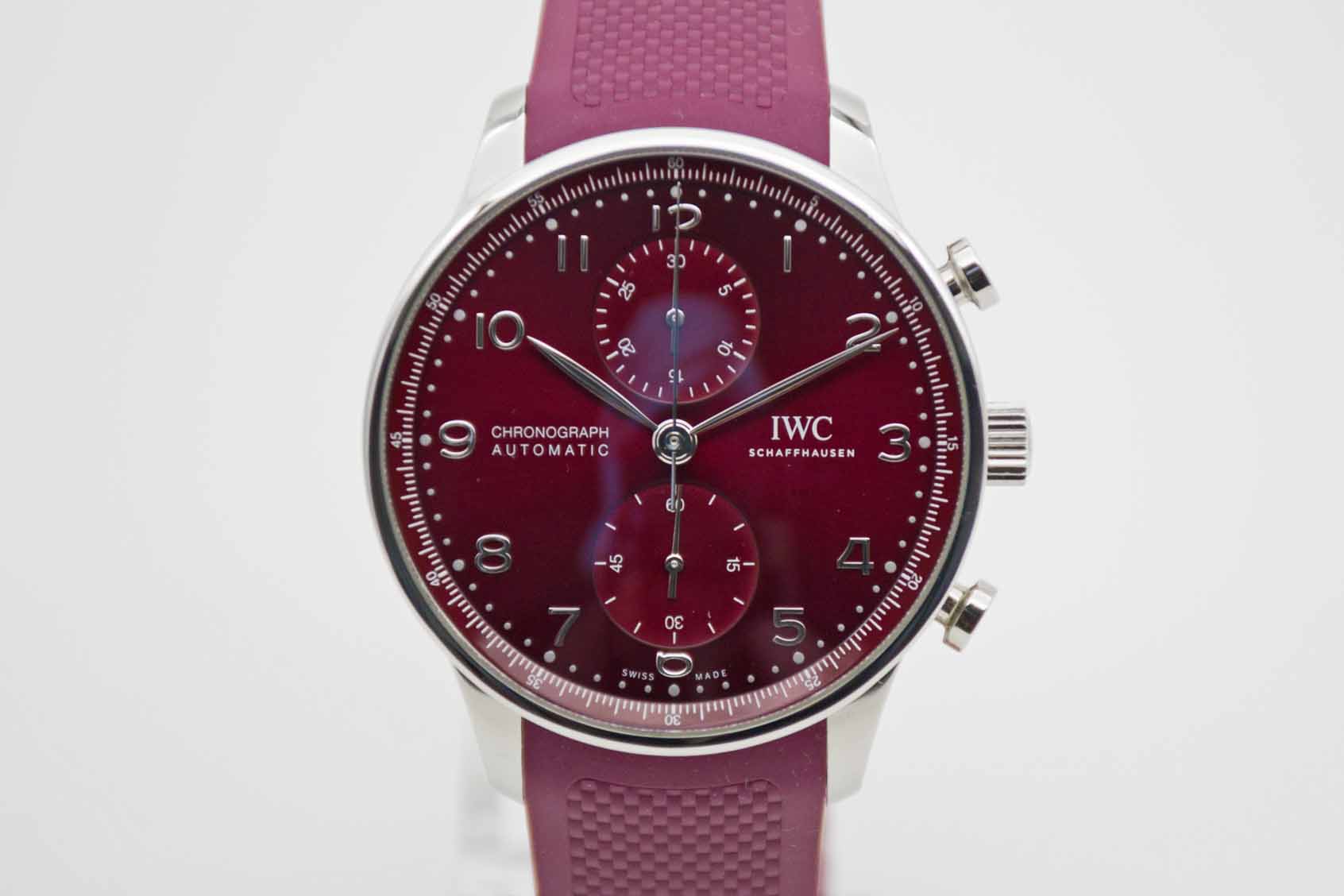 Portugieser Chronograph IW371616, 41 mm Gehäuse mit bordeaux-rotem Zifferblatt und perfekte passendem IWC Kautschuk Armband mit IWC Doppelfaltschließe. Perfektes Fullset in IWC Box mit Umkarton, Portugieser 3716 Bedienungsanleitung, Garantie Booklet, IWC Putztuch und IWC Garantiekarte aus 2020. Die Uhr befindet sich in perfektem und sehr gepflegtem Zustand. Inzahlungnahmen sind nur im direkten Geschäft möglich. Bitte sprechen Sie uns hierzu gerne an. Zu unserer Sicherheit lagern wir sämtliche Uhren unseres Bestandes extern im Banksafe, daher bitten wir um vorherige Terminvereinbarung.