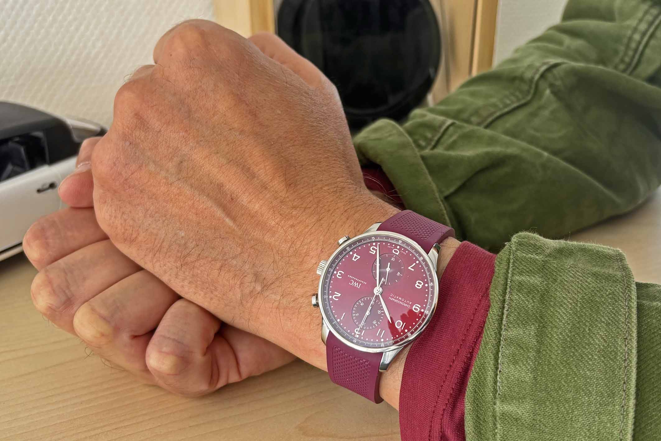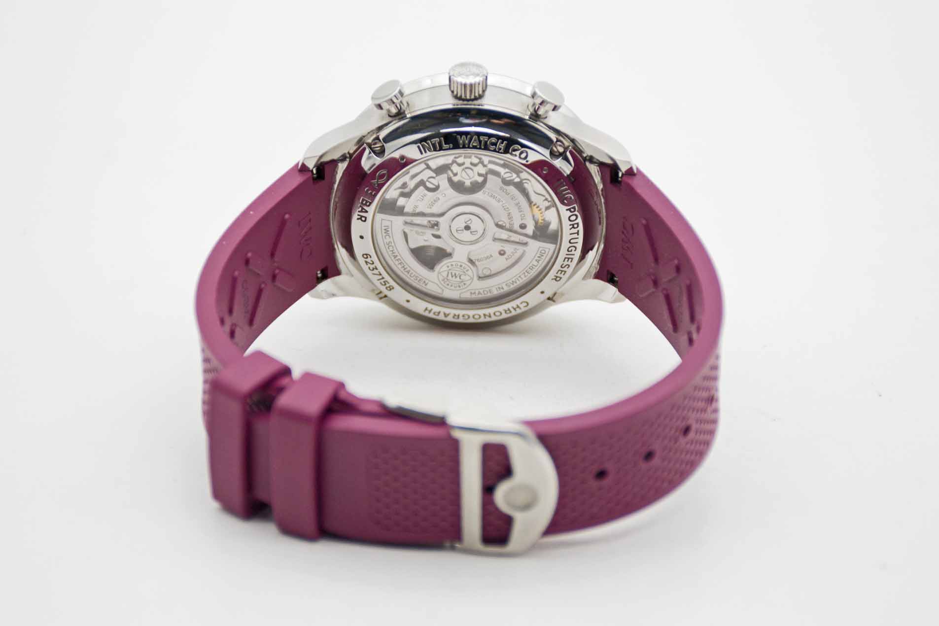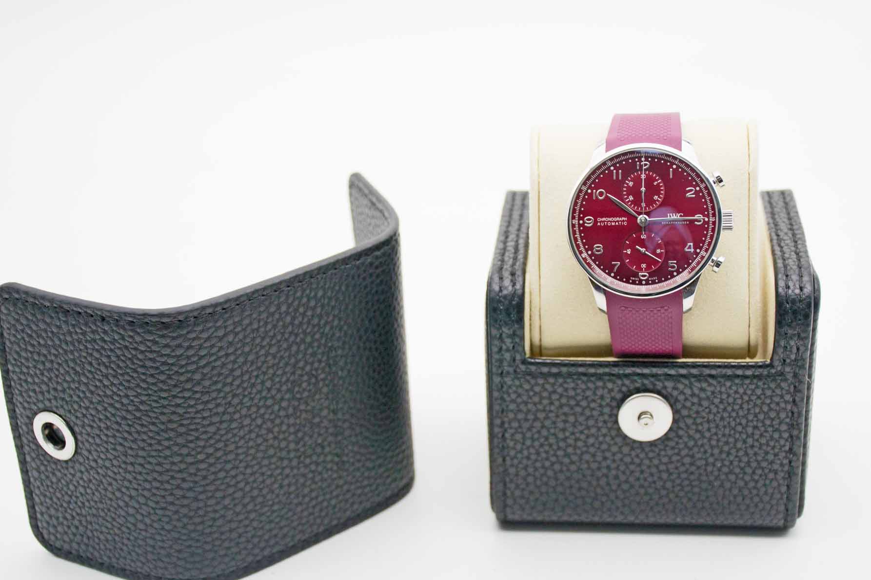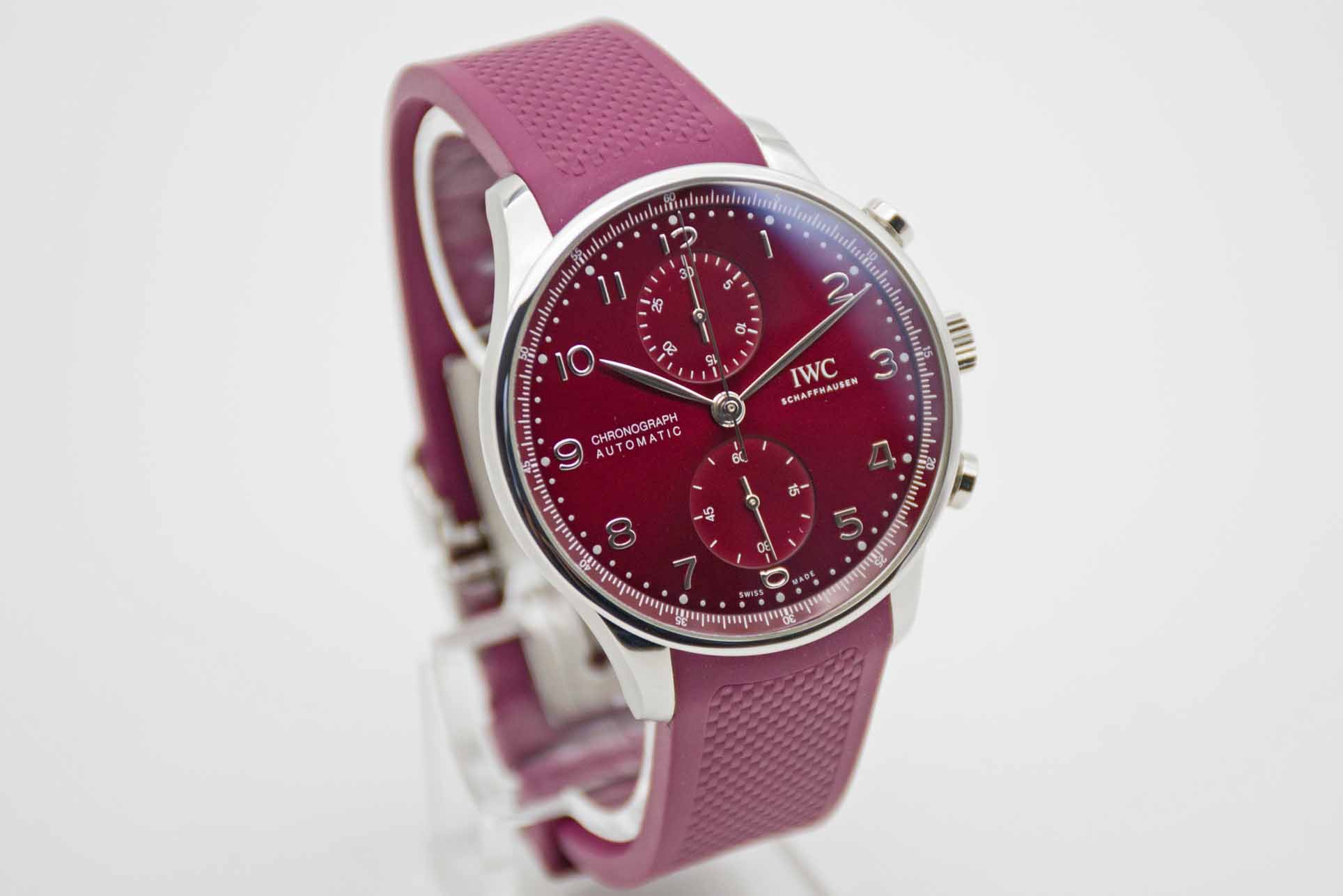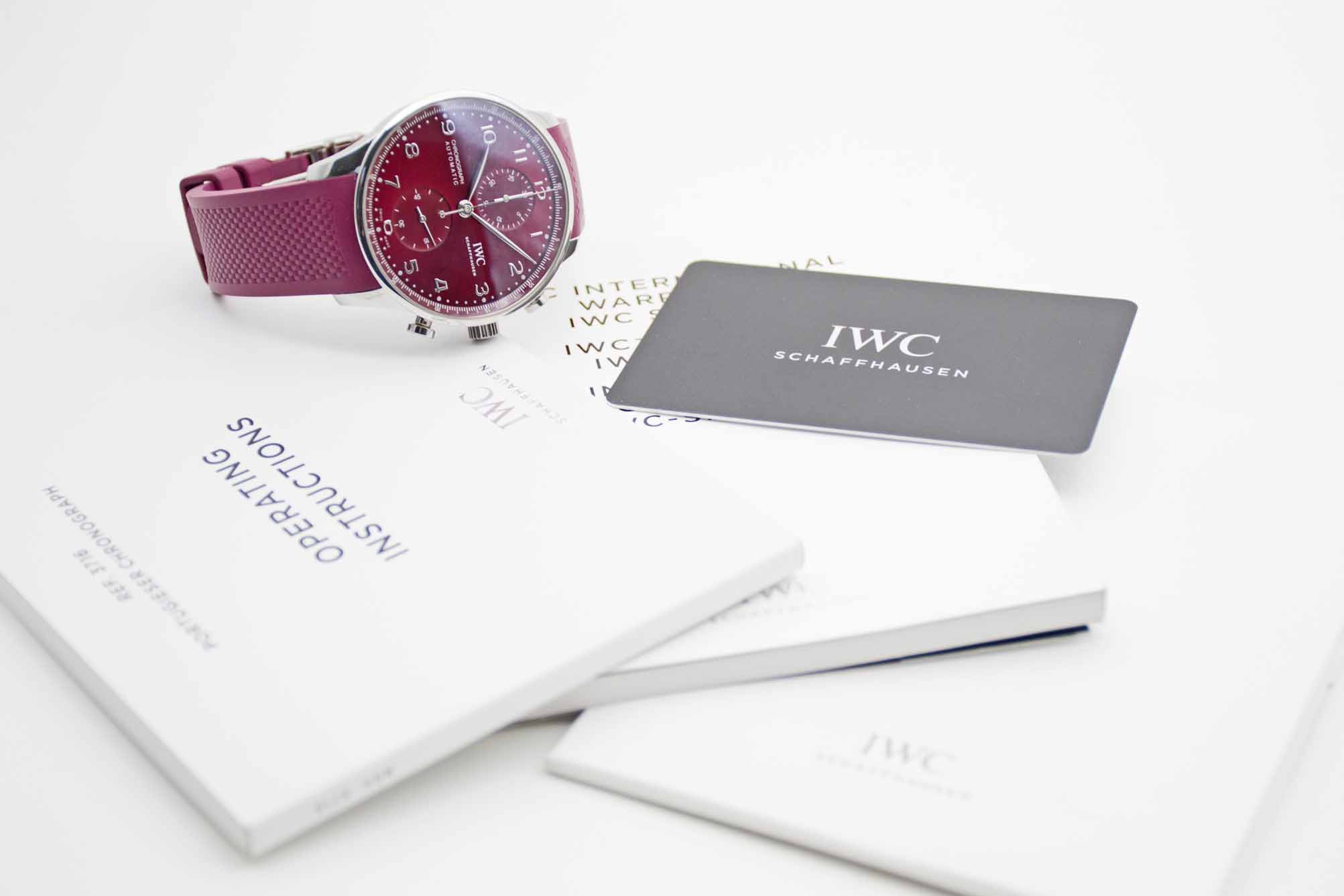 Portugieser Chronograph IW371616, 41 mm Gehäuse mit bordeaux-rotem Zifferblatt und perfekte passendem IWC Kautschuk Armband mit IWC Doppelfaltschließe. Perfektes Fullset in IWC Box mit Umkarton, Portugieser 3716 Bedienungsanleitung, Garantie Booklet, IWC Putztuch und IWC Garantiekarte aus 2020. Die Uhr befindet sich in perfektem und sehr gepflegtem Zustand. Inzahlungnahmen sind nur im direkten Geschäft möglich. Bitte sprechen Sie uns hierzu gerne an. Zu unserer Sicherheit lagern wir sämtliche Uhren unseres Bestandes extern im Banksafe, daher bitten wir um vorherige Terminvereinbarung.
