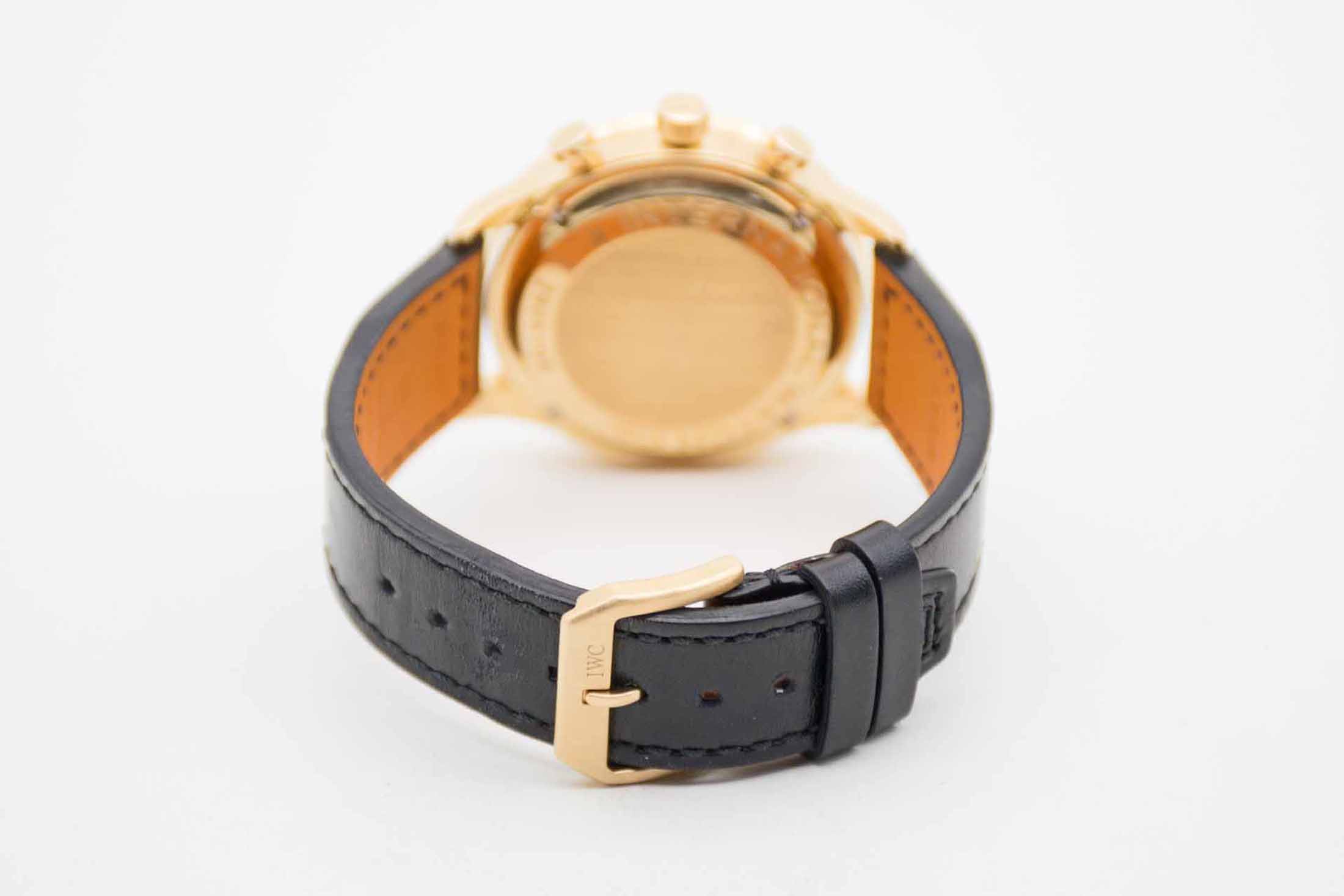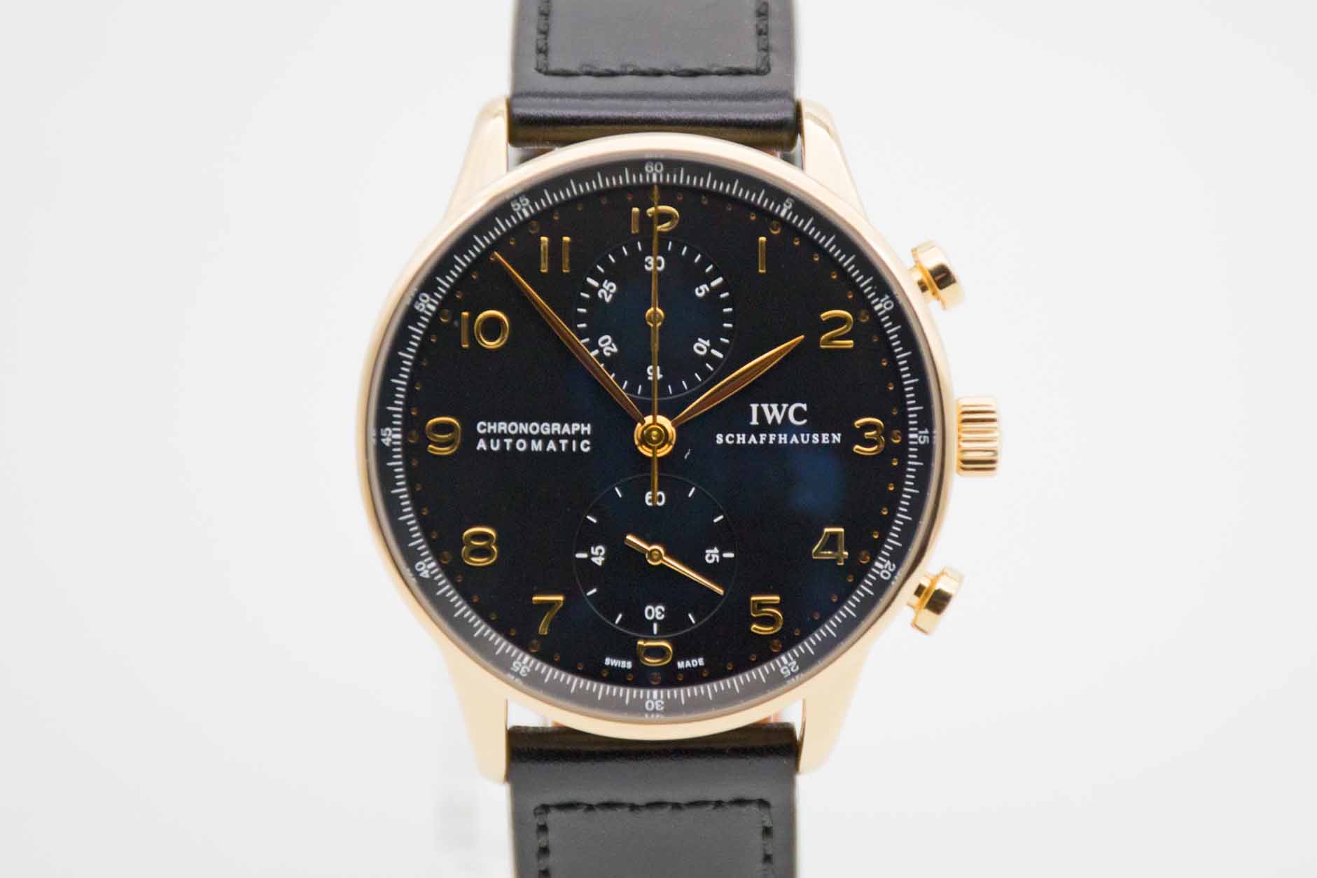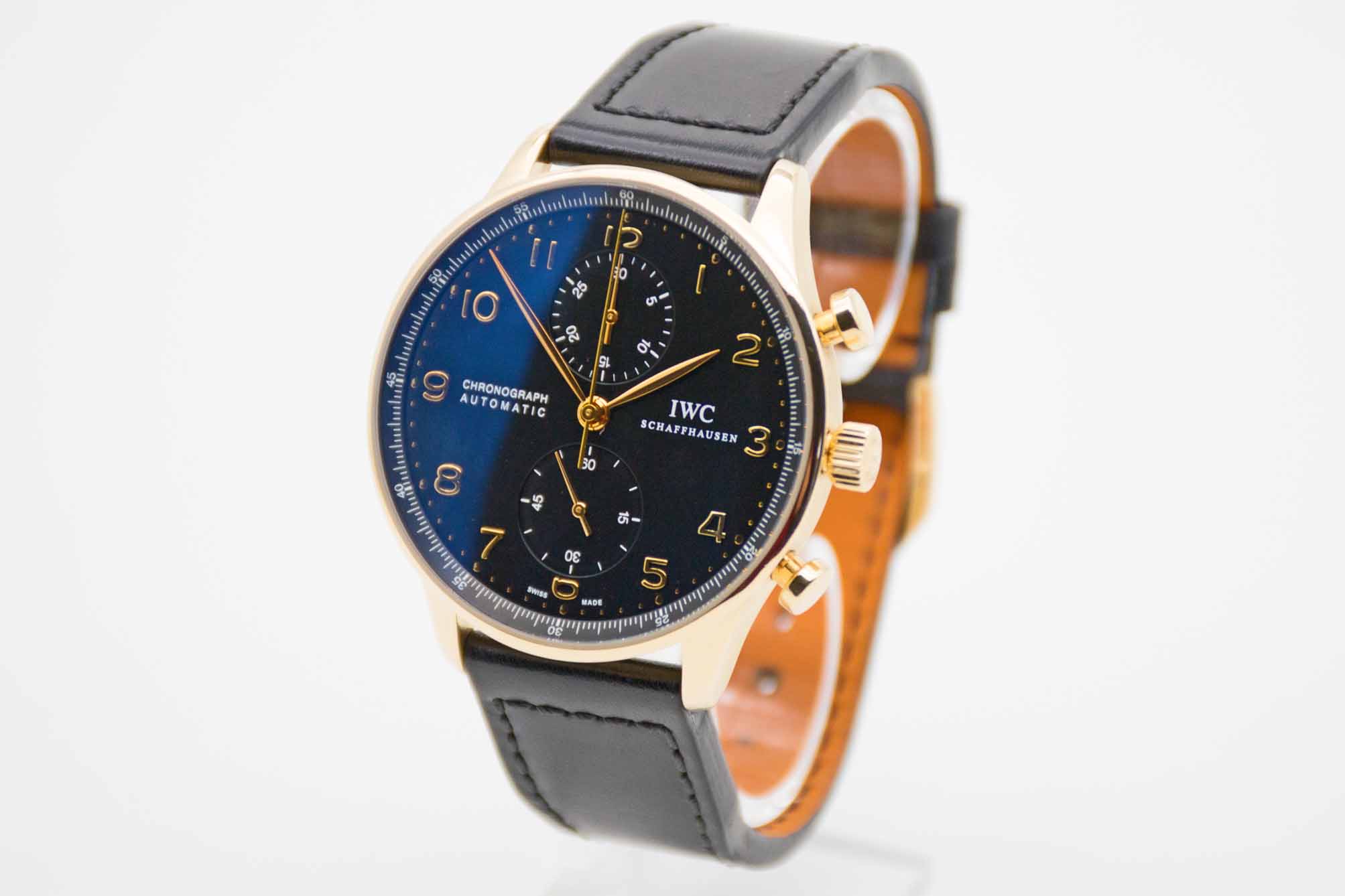 Portugieser Chronograph IW3714-02, 41 mm 18 kt Roségold Gehäuse mit schwarzem Zifferblatt und schwarzem IWC/Santoni Lederarmband mit IWC 18 kt Roségold Dornschließe. Sehr gepflegte Dressuhr in IWC Box mit sauberem Inlay (Oberflache mit Lager/Alterungsspuren), IWC Garantie Booklet, Portugieser Bedienunganleitung, IWC/Santoni Booklet und IWC Garantiekarte aus 2003 (deutsche Erstauslieferung). Die Uhr stammt aus 1. Hand und befindet sich in perfektem und sehr gepflegtem Zustand. Gerne nehmen wir Ihre hochwertige Armbanduhr in Anzahlung.