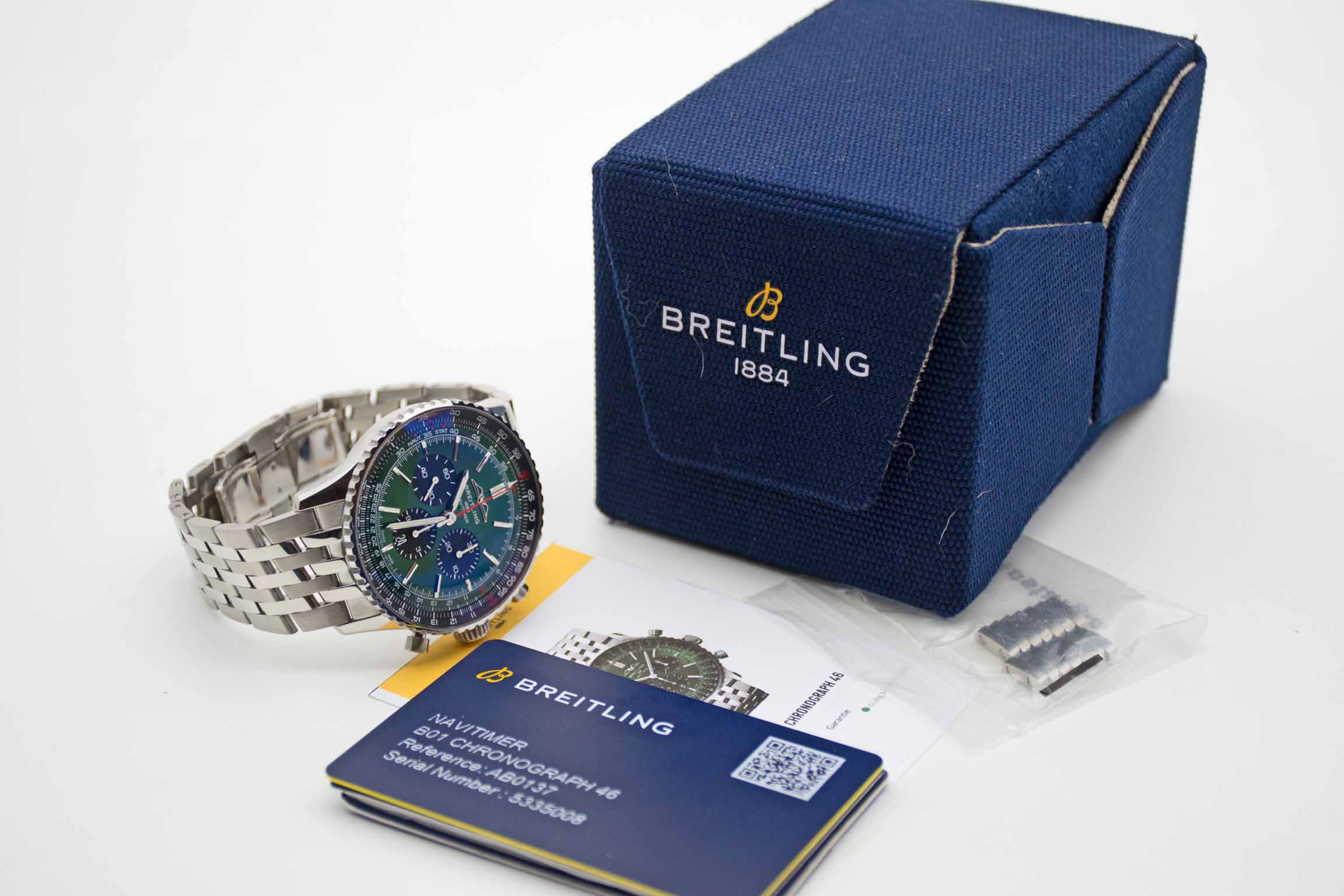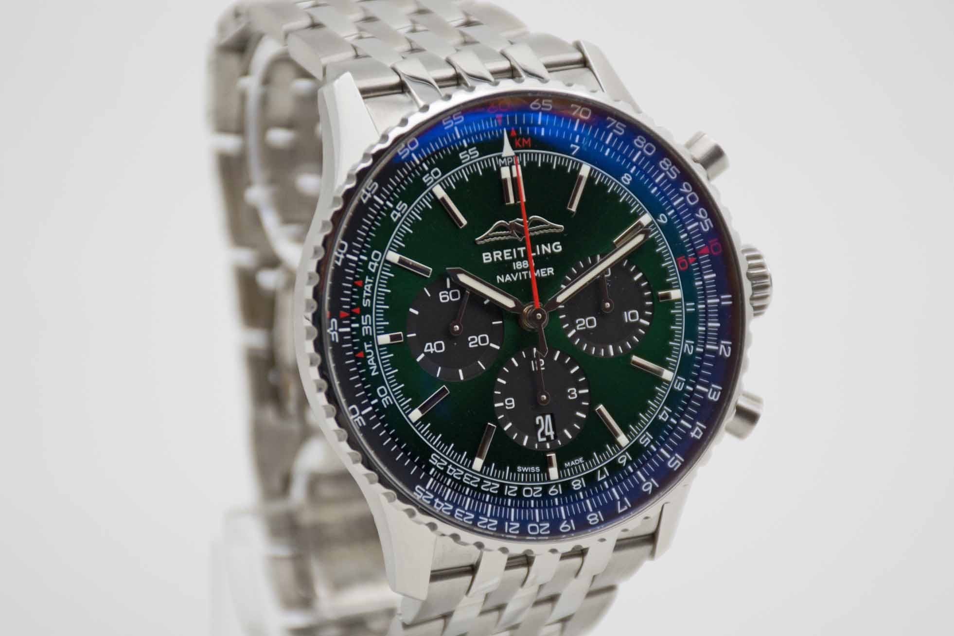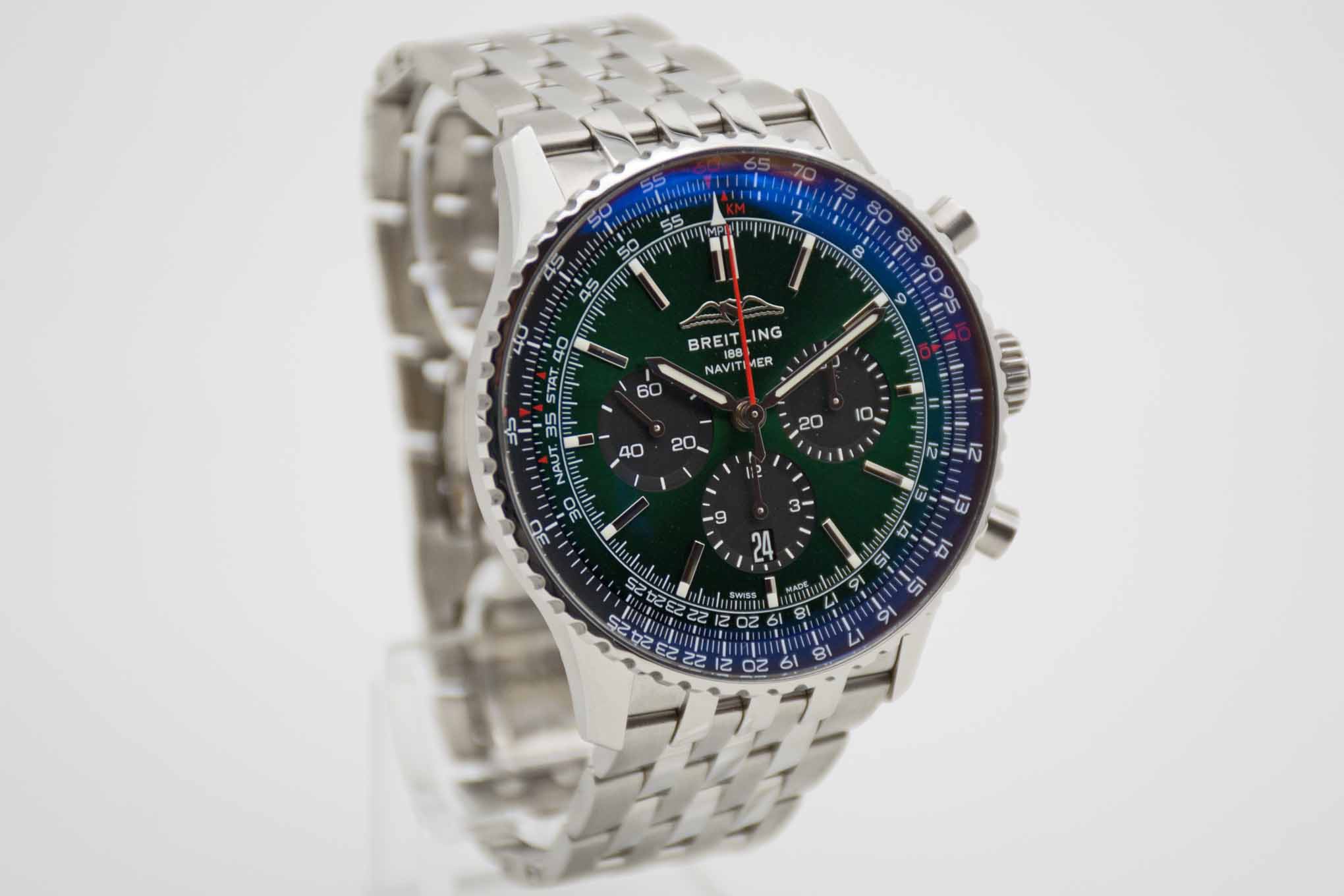 Navitimer B01 Chronograph 46 Bentley Green AB0137241L1A1, 46 mm stainless steel case with racing green dial and Breitling steel bracelet in full length. Perfect fullset in Breitling PET box with owners manual and original Breitling warranty card from 2025 (Breitling warranty valid up to 2033). The watch comes in perfect and mint condition like new. Trades are possible.
