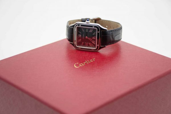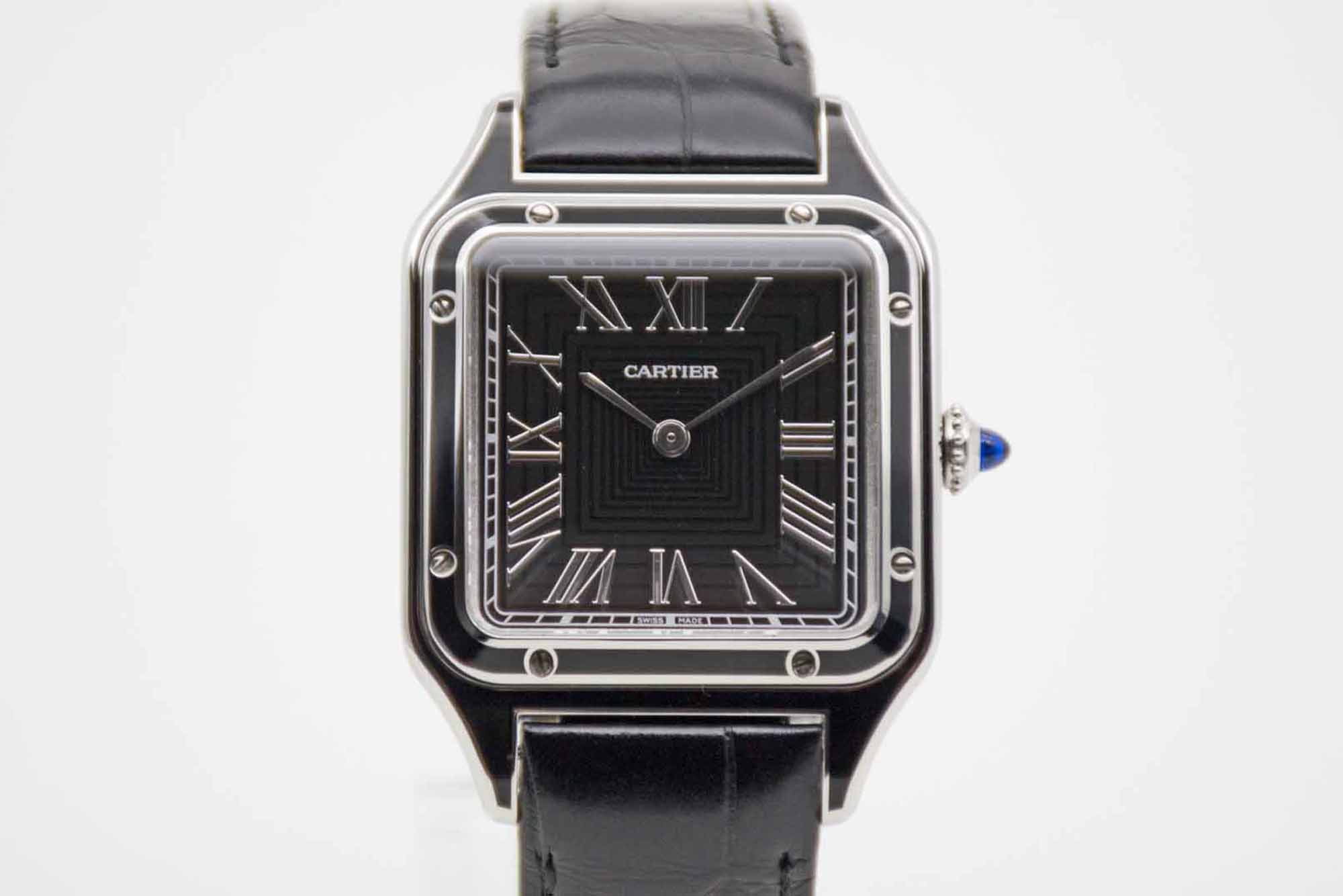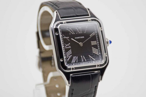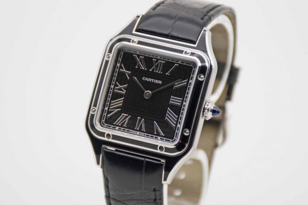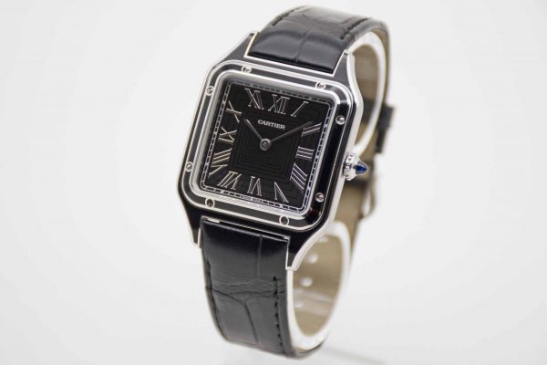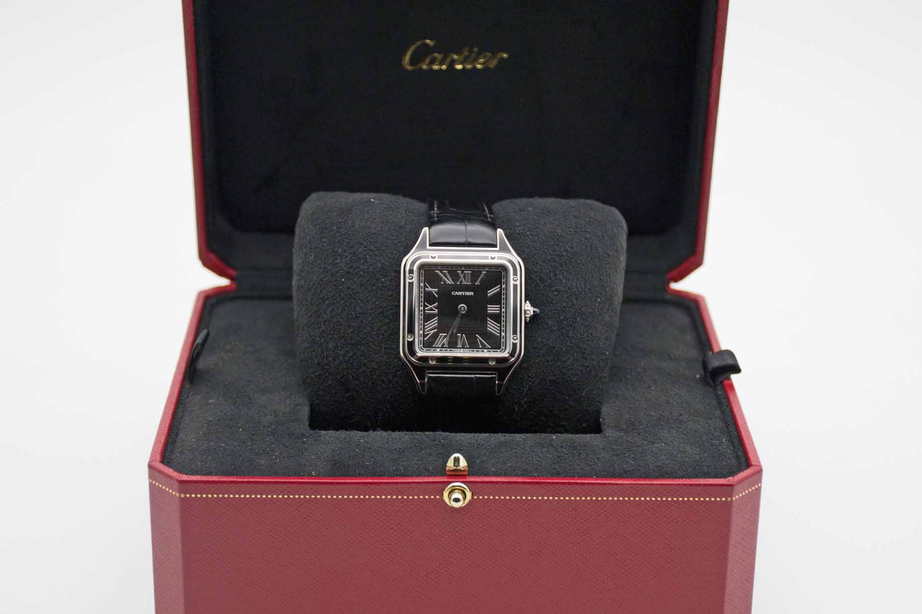 Santos Dumont Black Lacquer WSSA0046, Tank Solo XL 5200026, 43,5 x 31,5 mm case with black roman Lacquer dial and black Cartier alligator strap with Cartier buckle. Full set in red Cartier inner and outer box with manual/service booklet, bezel protector, Cartier extended warranty until 2031 and original Cartier warranty card from 2023. The watch comes in perfect and mint condition like new from the first owner.
