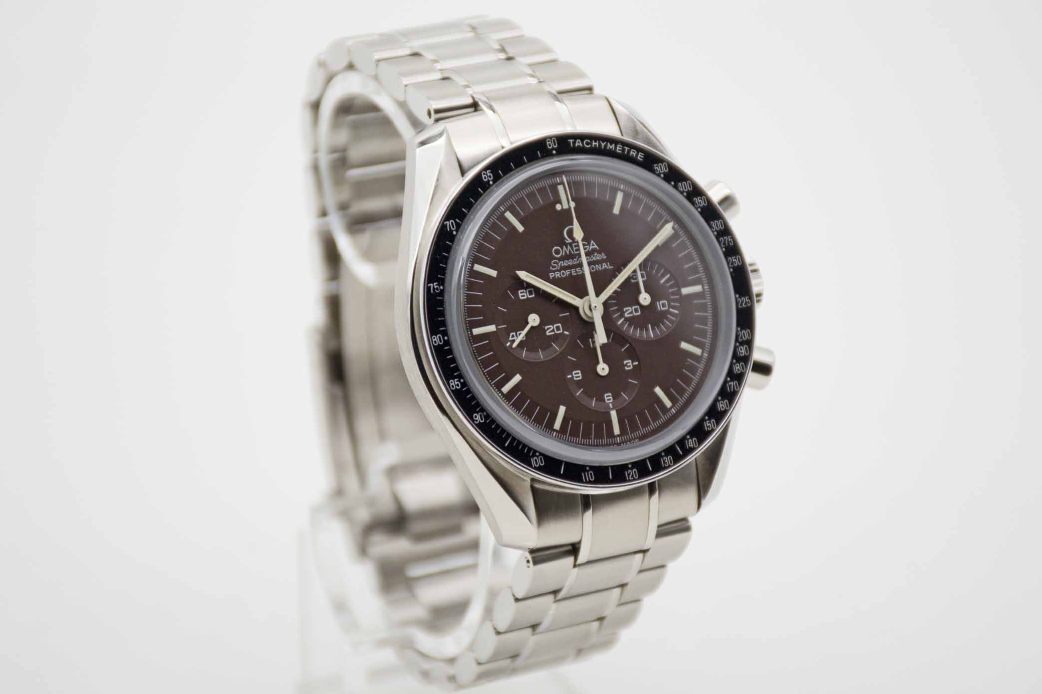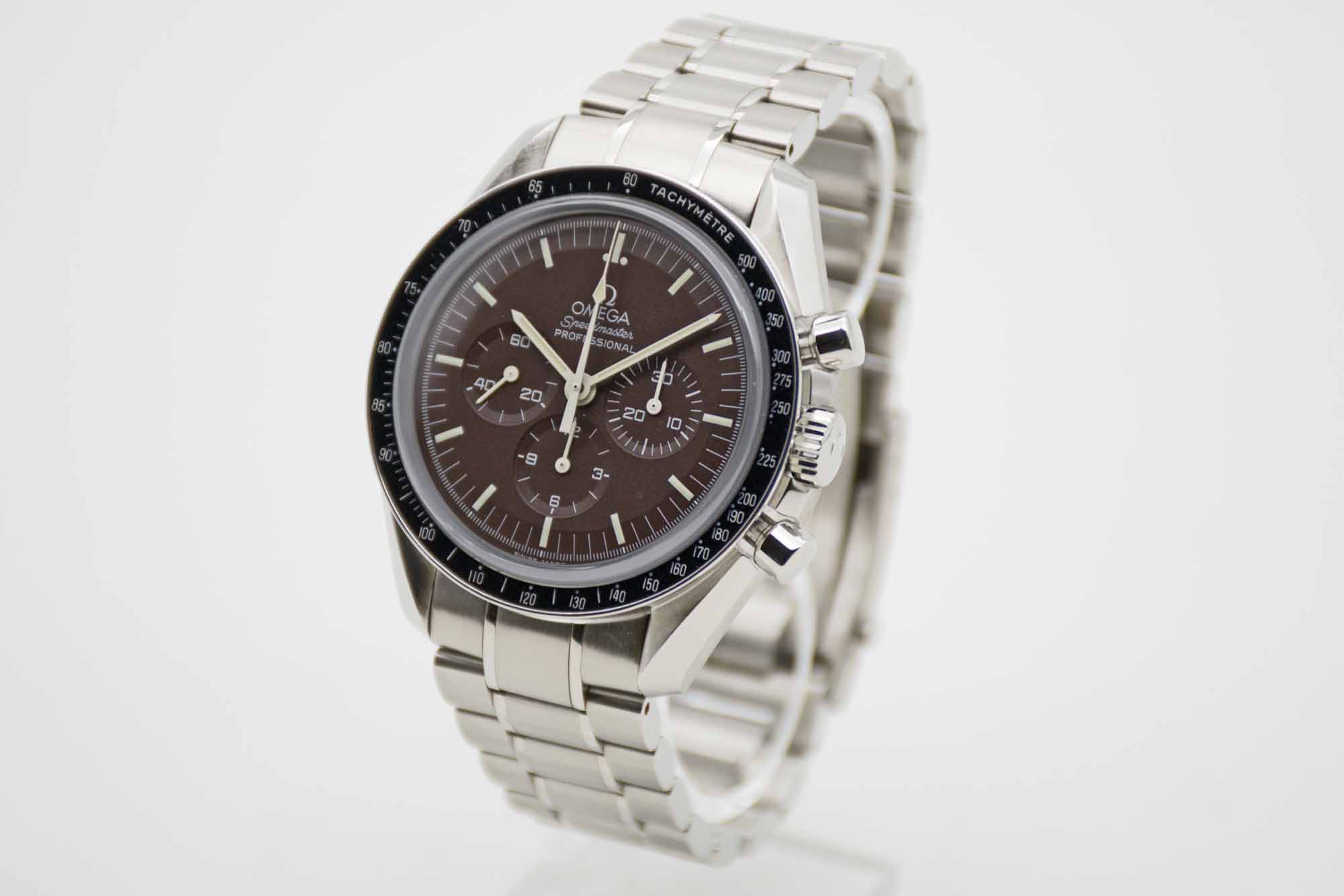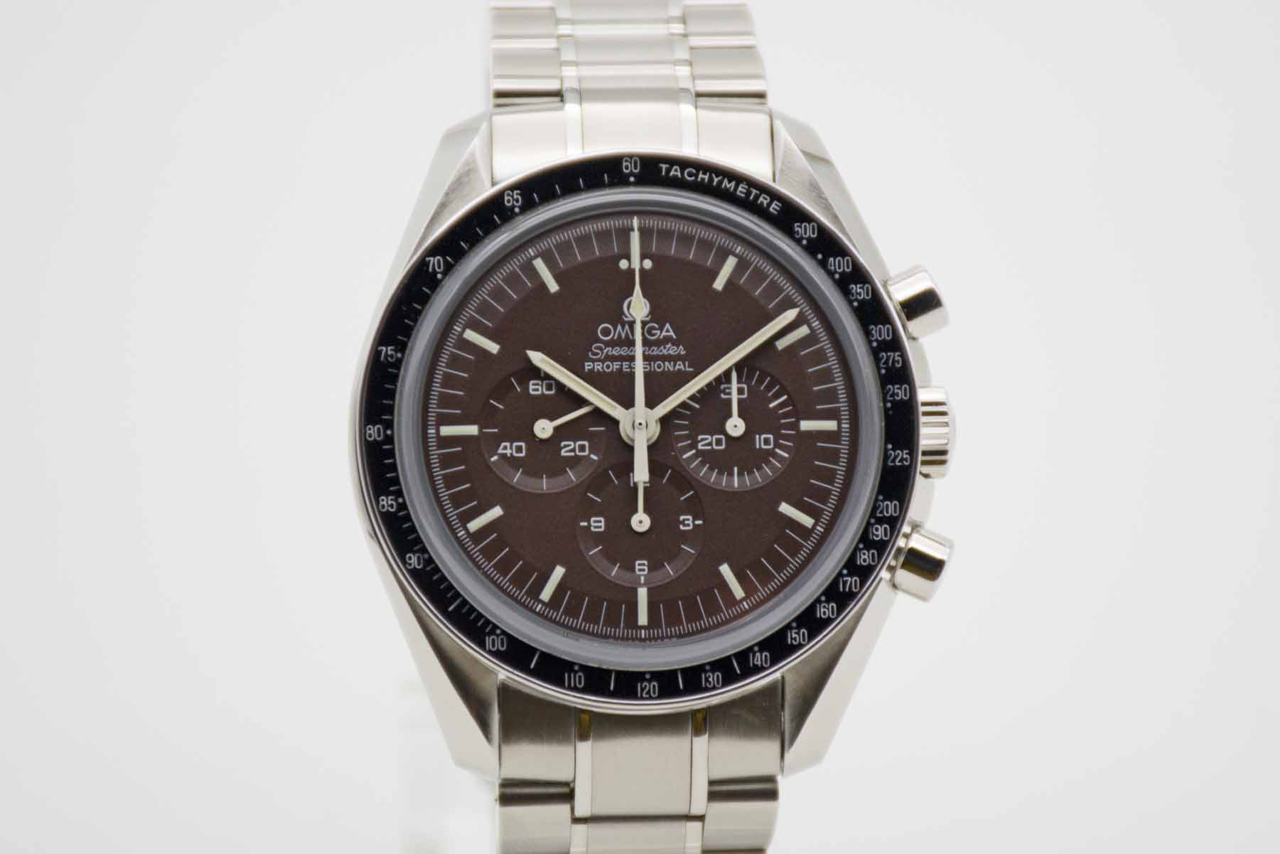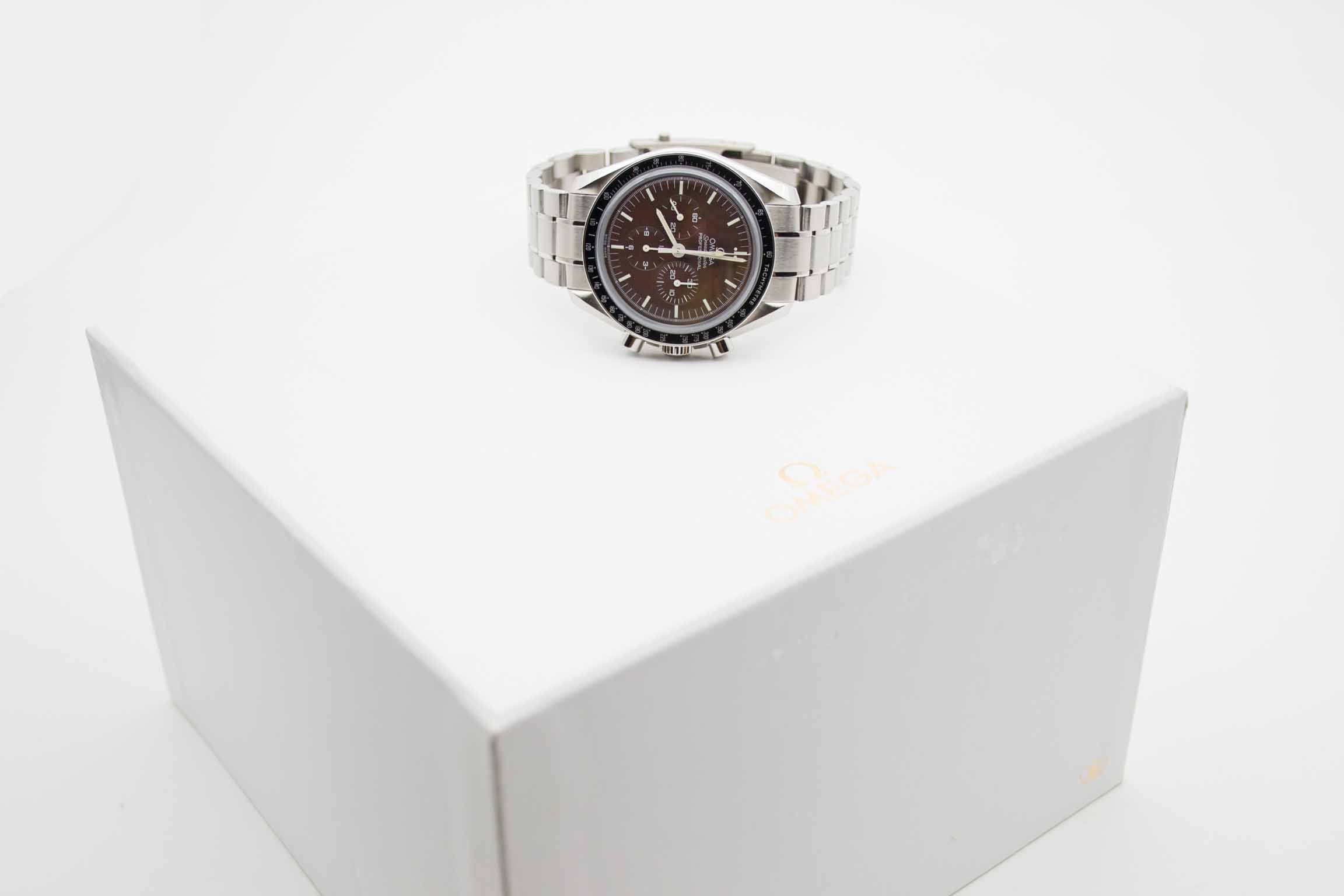 Speedmaster Professional Moonwatch Brown Dial Saphire Sandwich 311.30.42.30.13.001, 42 mm Gehäuse mit braunem Zifferblatt und Omega Edelstahlarmband. Die Uhr kommt in brauner Omega Box mit Umkarton, Bedienungsanleitung, Lederetui und Omega Garantiekarte aus 2013. Die Uhr befindet sich in perfektem und sehr gepflegtem Zustand. Inzahlungnahmen sind nur im Dirktgeschäft möglich. Zu unserer Sicherheit lagern wir sämtliche Uhren unseres Bestandes extern im Banksafe, daher bitten wir um vorherige Terminvereinbarung.