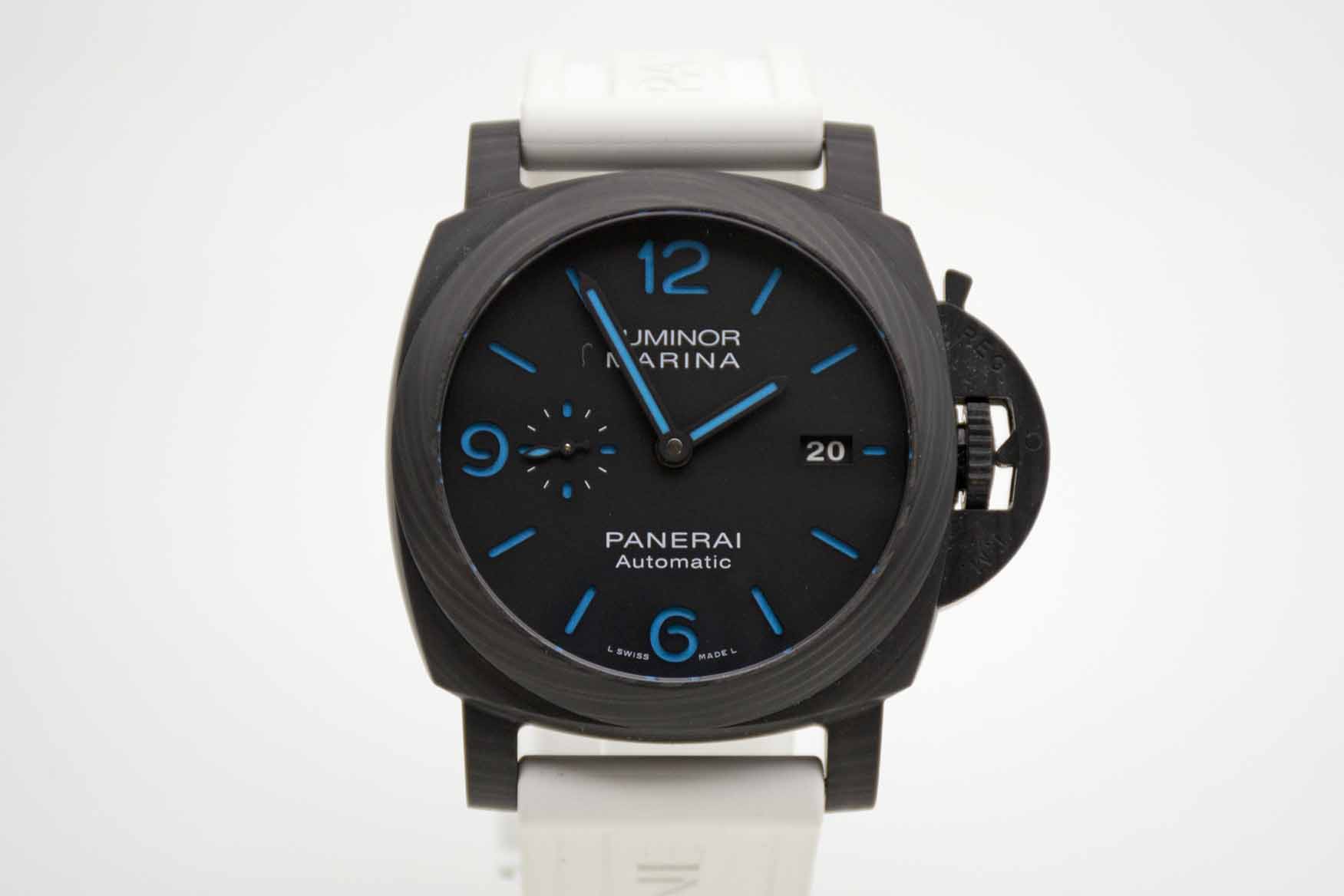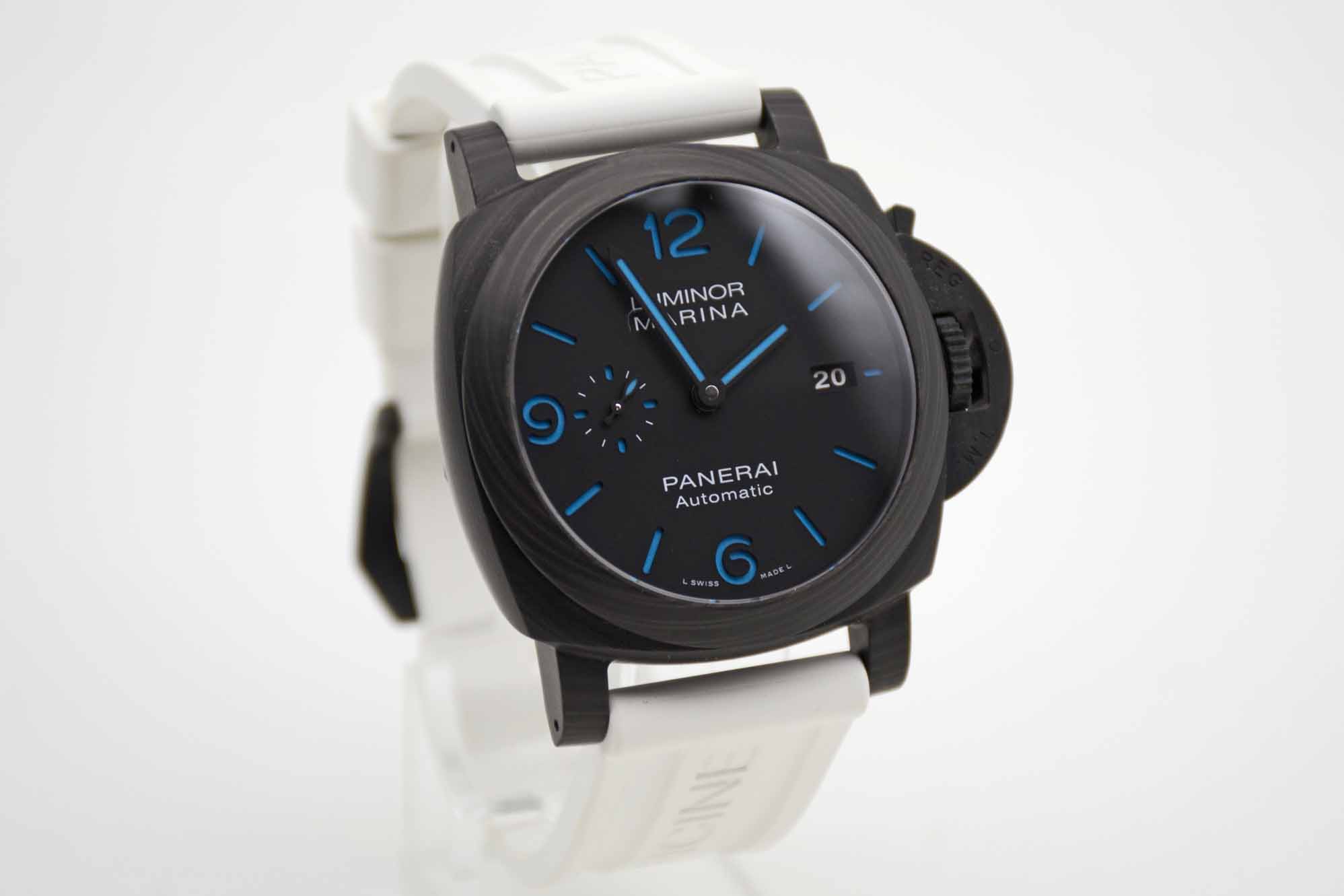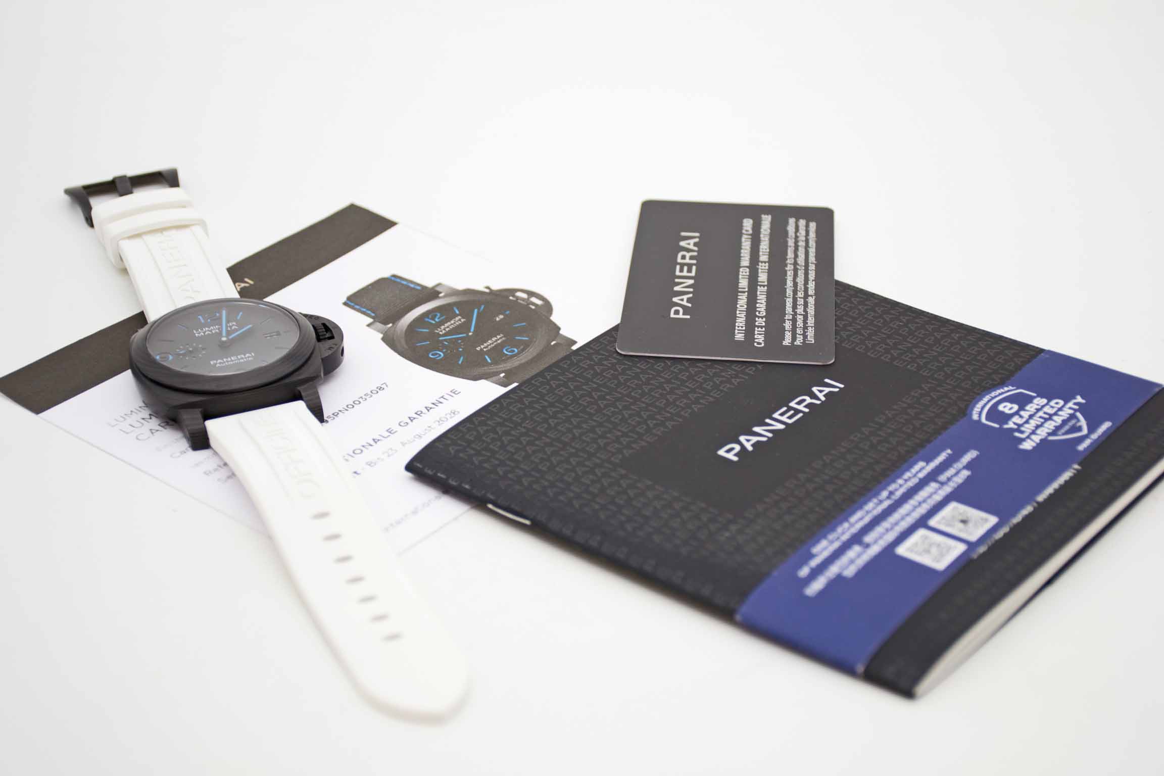 Luminor Marina Carbotech PAM001661, 44 mm Carbon Gehäuse mit schwarzem Sandwich Zifferblatt und weißem Panerai PAM-Click Kautschuk Armband mit schwarzer Panerai Dornschließe. Perfekte Carbotch in Panerai Box mit Umkarton, Gebrauchsanweisung/Garantiebooklet, gebrauchtem Panerai Nylon Armband, Schraubenzieher, Panerai Garantieverlängerung bis 2028 und Panerai Garantiekarte aus 2020. Sehr leichter Diver in perfektem Zustand. Inzahlungnahmen sind nur im Direktgeschäft möglich. Zu unserer Sicherheit lagern wir sämtliche Uhren unseres Bestandes extern im Banksafe, daher bitten wir um vorherige Terminvereinbarung.