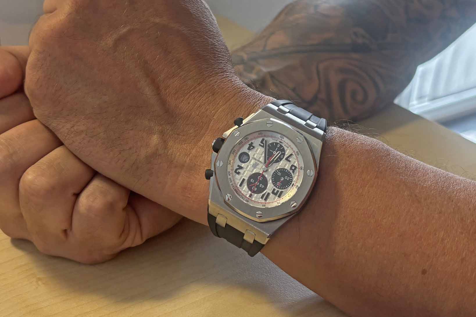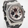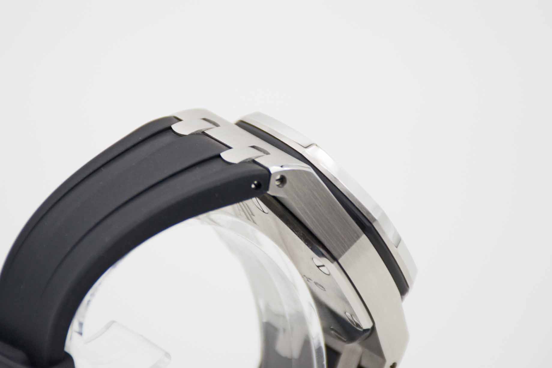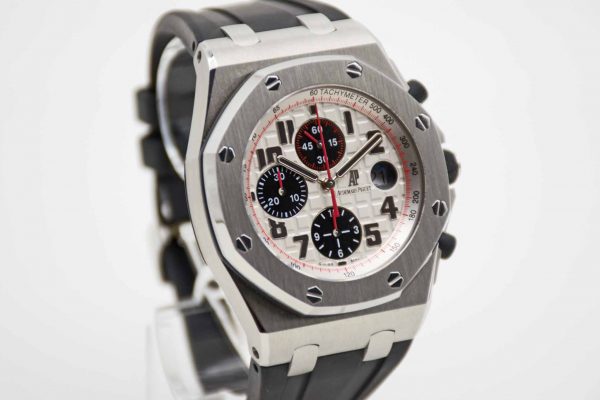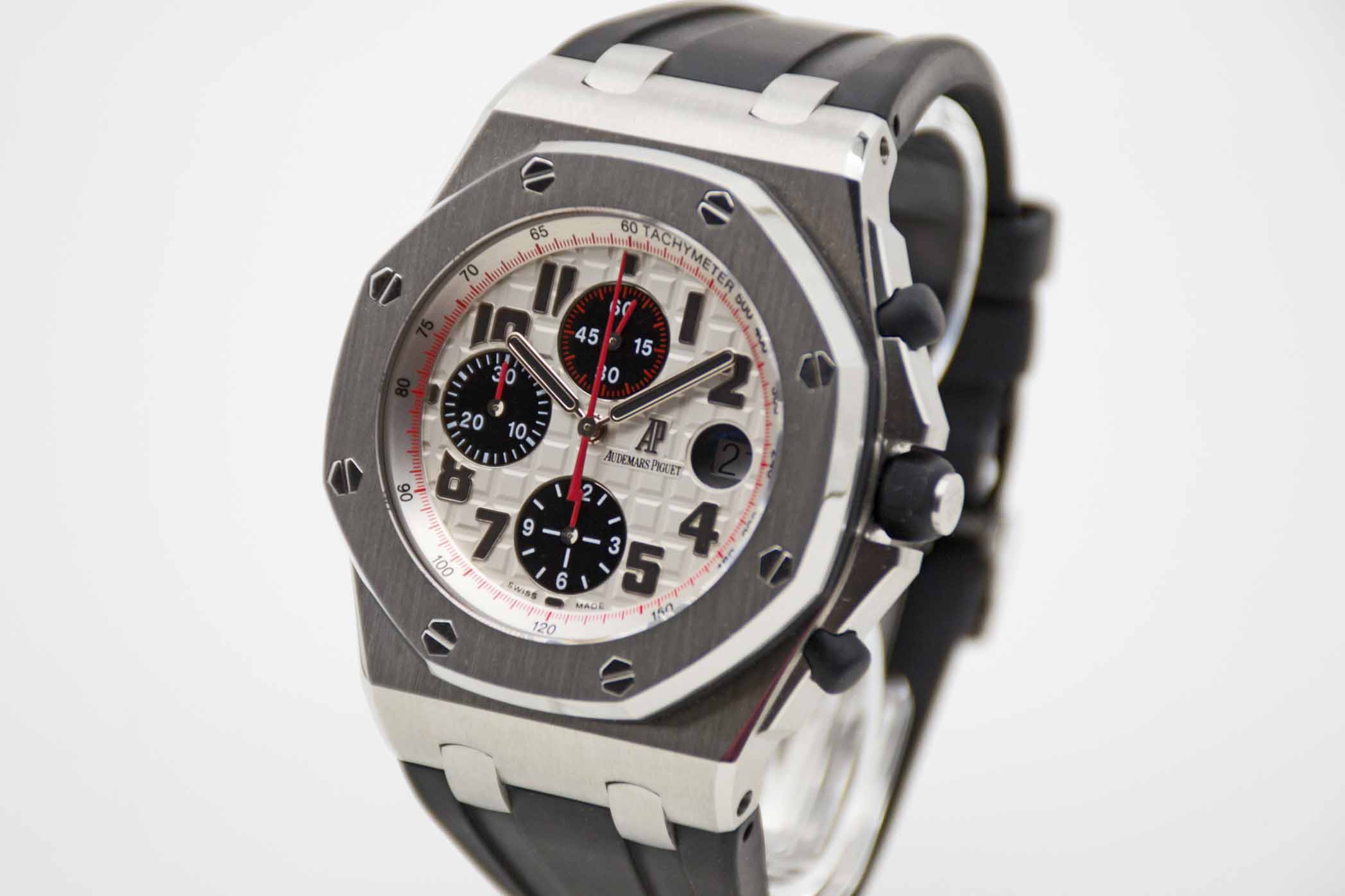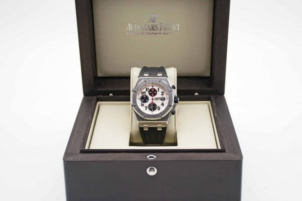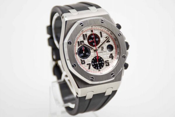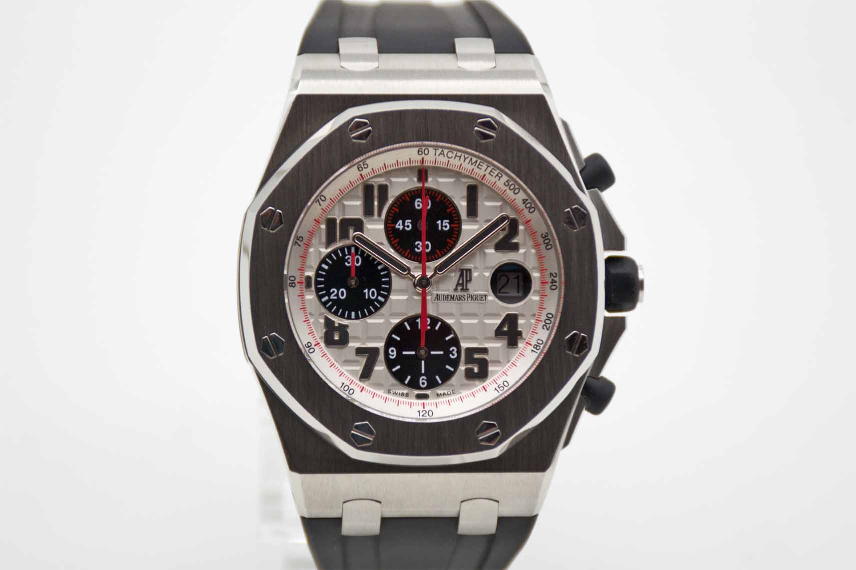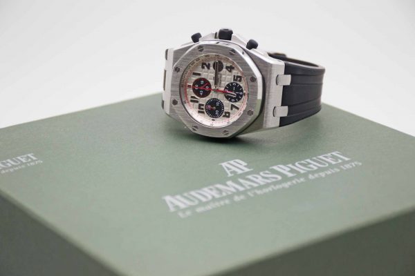 Royal Oak Offshore Chronograph 26170ST.OO.D101CR.02, 42 mm Gehäuse mit perfekter Lünette ohne Beschädigungen, silbernem Panda Zifferblatt und schwarzem AP Kautschuk Armband mit AP Faltschließe. Perfektes Fullset in AP Holzbox mit sauberem Inlay und Umkarton, Bedienungsanleitung, Drucktest aus 2024, Garantie Booklet (großer AP Service A in 08/2023 eingetragen) und Audemars Piguet Garantie Zertifikat aus 2010. Dieser Offshor Chrono befindet sich in perfektem und sehr gepflegtem Zustand. Inzahlungnahmen sind nur bei direktem Kontakt möglich. Zu unserer Sicherheit lagern wir sämtliche Uhren unseres Bestandes extern im Banksafe, daher bitten wir um vorherige Terminvereinbarung.