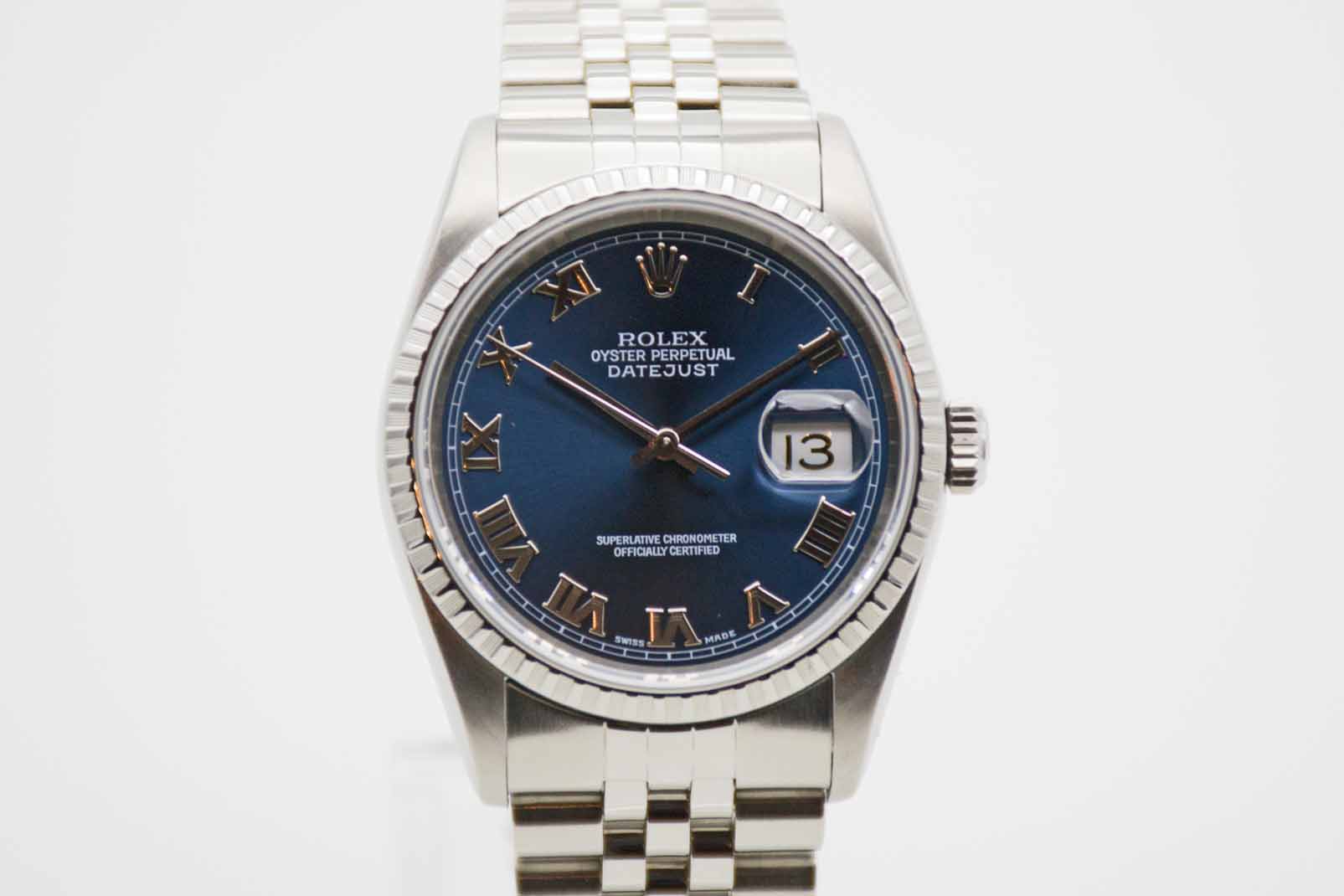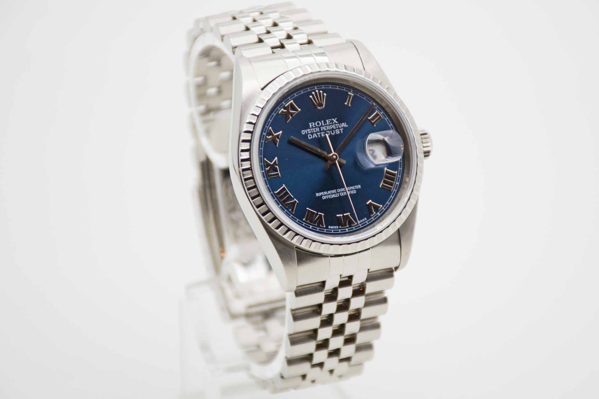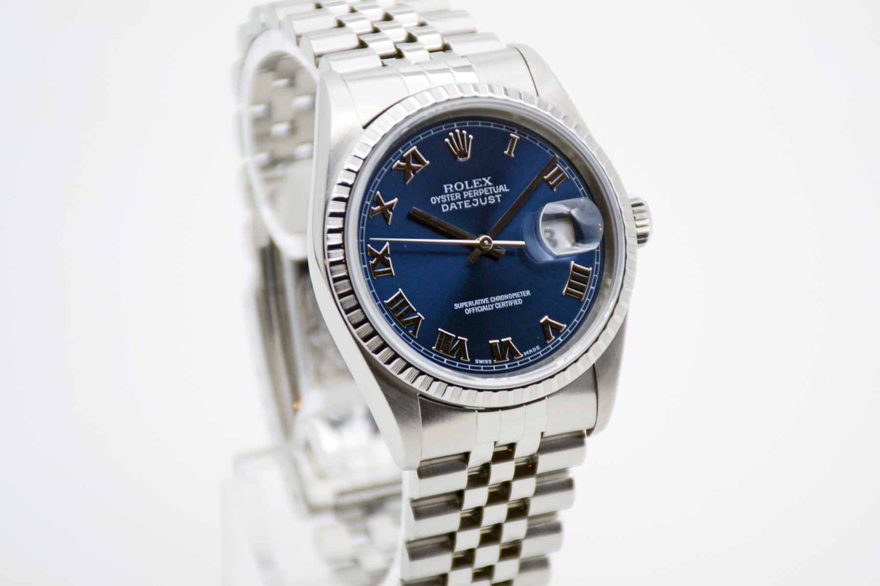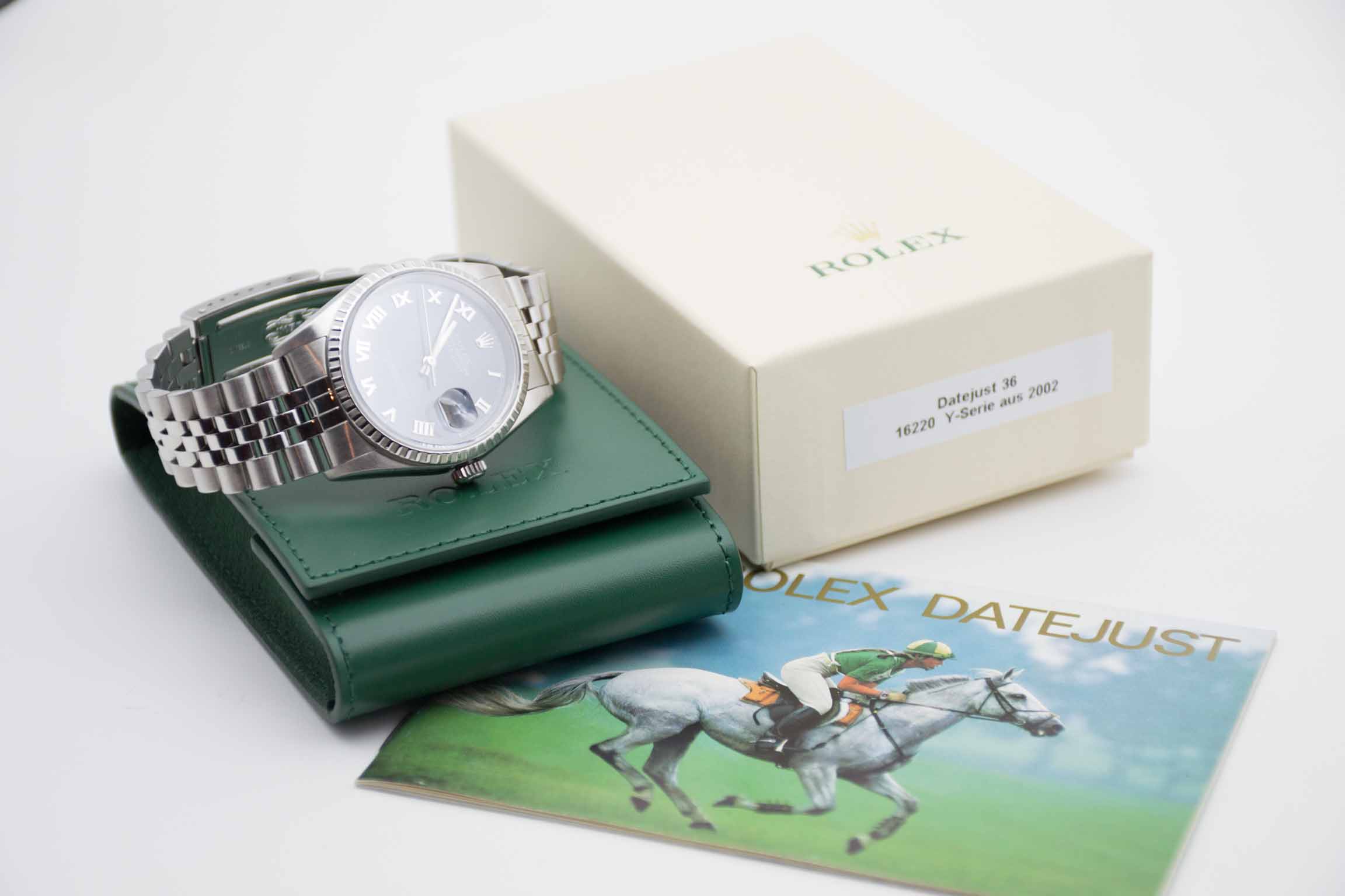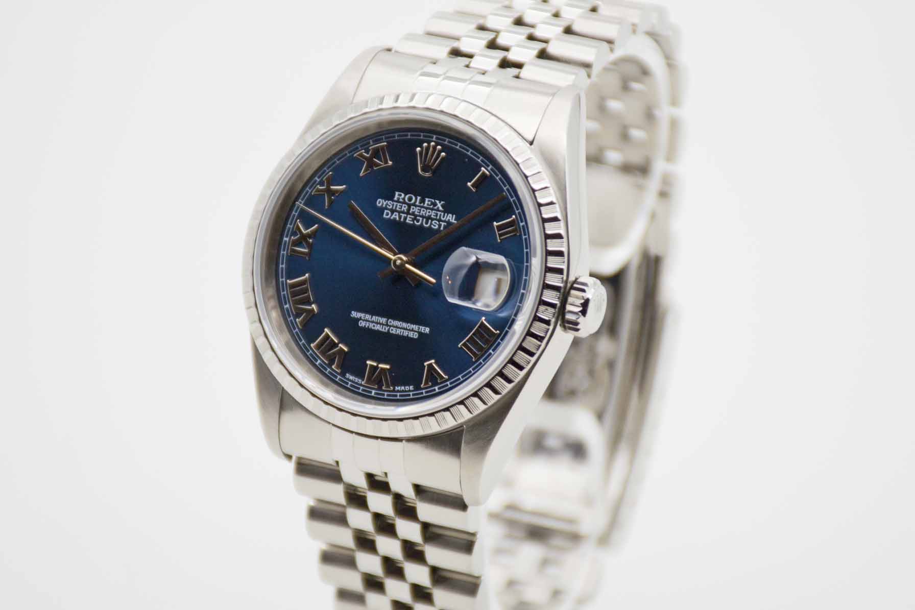 Datejust 36 Blue Roman 16220, 36 mm Gehäuse ohne Bohrungen mit blauem Zifferblatt und Rolex Jubilée Armband mit passender Schließe (Code DT8/2002). Perfekter Neovintage Klassiker mit neuem Service, 1 Jahr Garantie und Rolex Service Box mit Umkarton. Die Uhr befindet sich in perfektem und sehr gepflegtem Zustand. Inzahlungnahmen sind auf Chrono24 nicht möglich. Bitte sprechen Sie uns hierzu an.