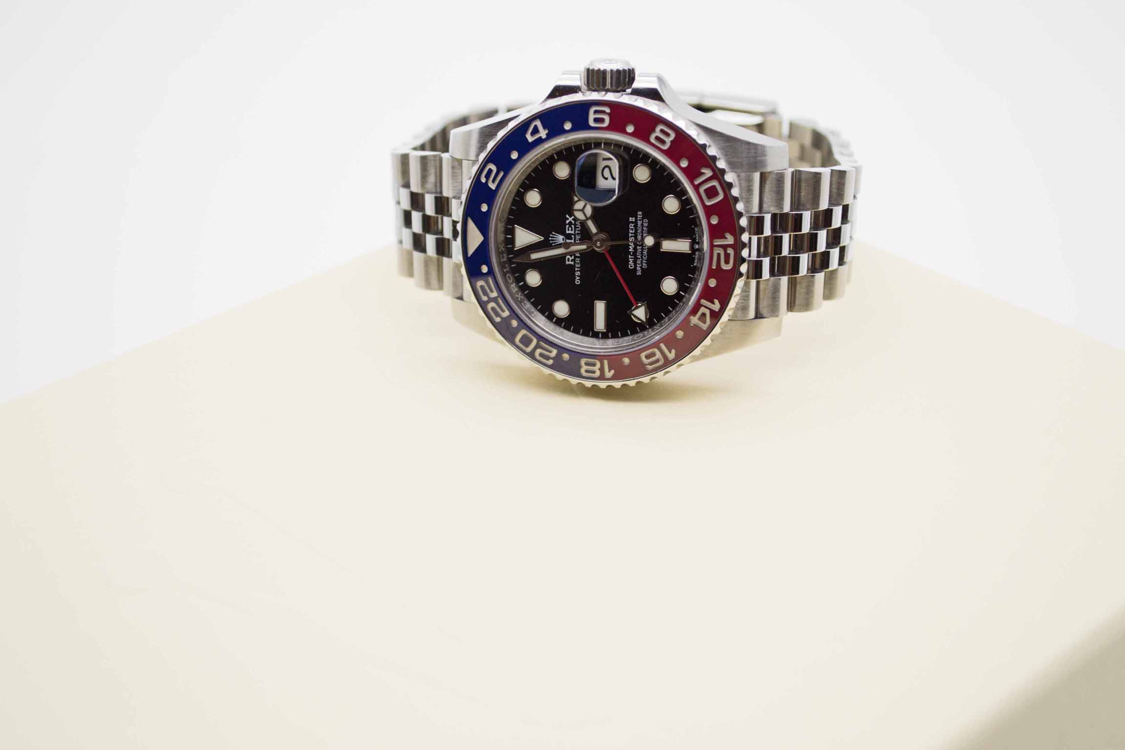 GMT Master II Pepsi 126710BLRO, 40 mm Gehäuse mit schwarzem Zifferblatt, blau/roter Keramik Lünette und Rolex Jubilée Armband. Perfektes Fullset in Rolex Box mit Umkarton und Schuber, deutschsprachiger Anleitung, Garantie Booklet, Hang Tag, Preisschild mit Gehäuse Nr., grünem Lederetui, Erstkaufrechnung (Rolex Boutique und Rolex Garantiekarte aus 2019). (LC100/Deutschland). Die Uhr stammt aus erster Hand und befindet sich in perfektem und neuwertigem Zustand.